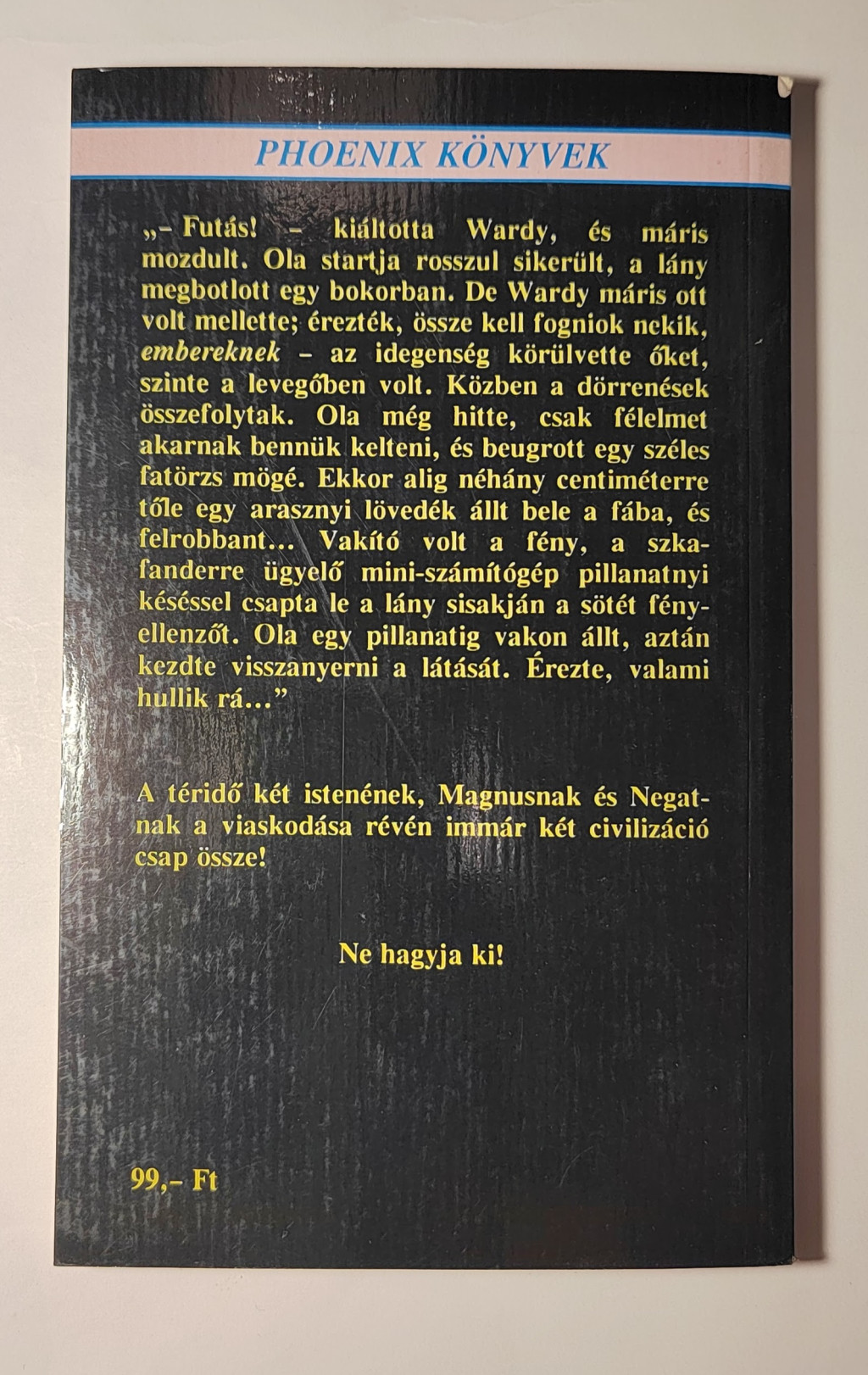 „- Futás! – kiáltotta Wardy, és máris mozdult. Ola startja rosszul sikerült, a lány megbotlott egy bokorban. De Wardy máris ott volt mellette; érezték, össze kell fogniok nekik, embereknek – az idegenség körülvette őket, szinte a levegőben volt. Közben a dörrenések összefolytak. Ola még hitte, csak félelmet akarnak bennük kelteni, és beugrott egy széles fatörzs mögé. Ekkor alig néhány centiméterre tőle egy arasznyi lövedék állt bele a fába, és felrobbant… Vakító volt a fény, a szkafanderre ügyelő mini-számítógép pillanatnyi késéssel csapta le a lány sisakján a sötét fényellenzőt. Ola egy pillanatig vakon állt, aztán kezdte visszanyerni a látását. Érezte, valami hullik rá…”