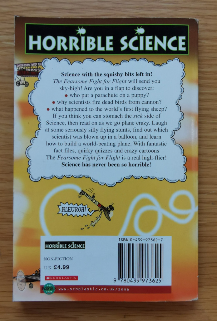 Science with the squishy bits left in. "The Fearsome Fight for Flight" will send you sky-high. Are you in a flap to discover who put a parachute on a puppy? Why scientists fire dead birds from cannon? What happened to the world's first flying sheep? If you think you can stomach the sick side of Science; then read on as we go plane crazy. Laugh at some seriously silly flying stunts, find out which scientist was blown up in a balloon, and learn how to build a world-beating plane. With fantastic fact files, quirky quizzes and crazy cartoons, "The Fearsome Fight for Flight" is a real high-flier. Science has never been so horrible.