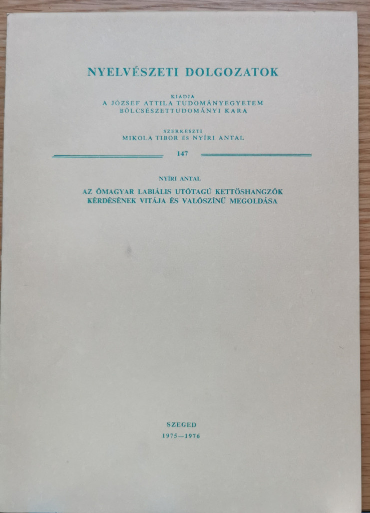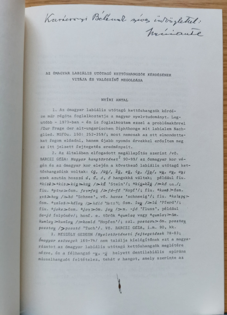 Nyíri Antal: Az ómagyar labiális utótagú kettőshangzók kérdésének vitája és valószínű megoldása  (Dedikált!)