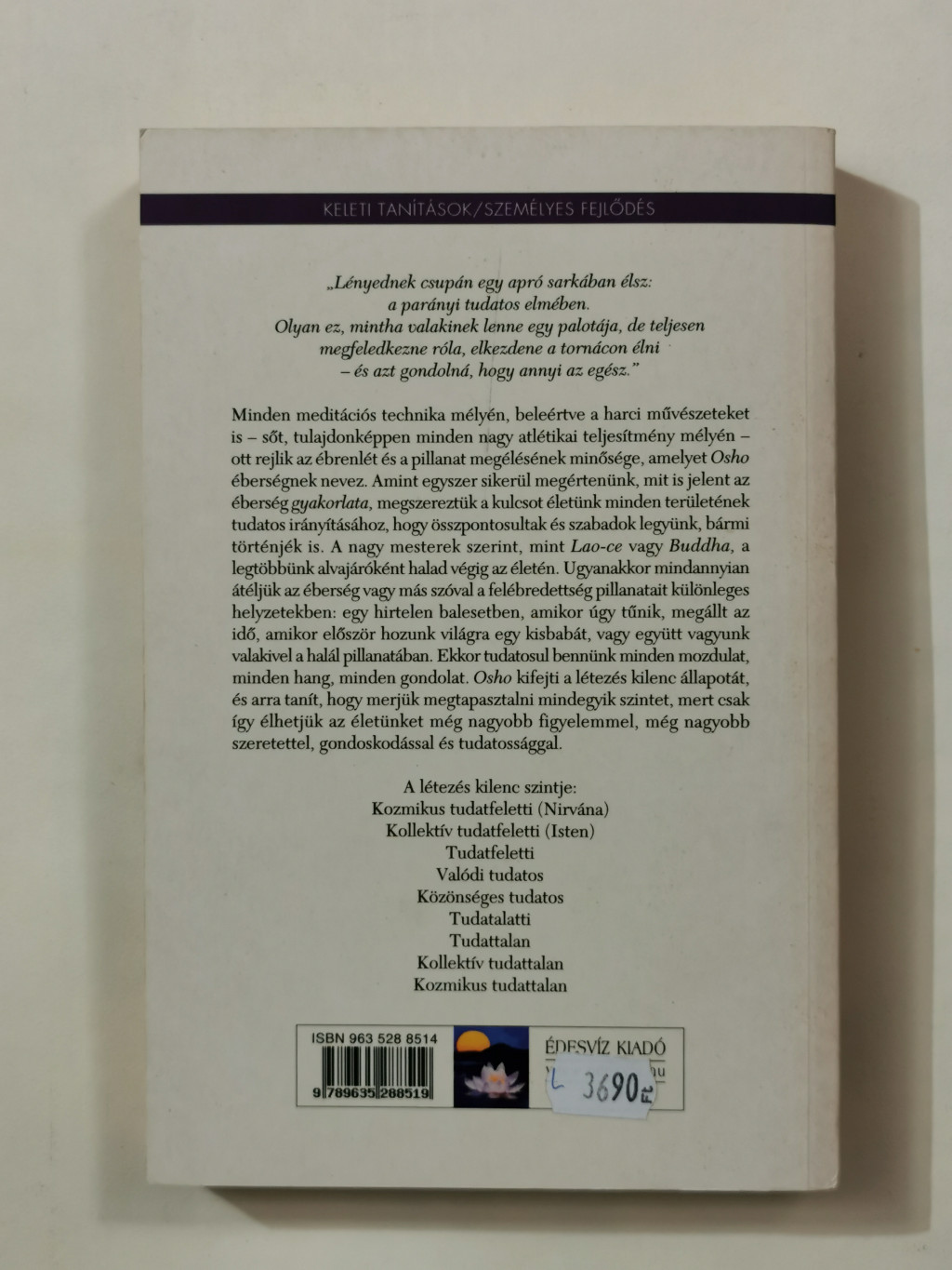 Minden meditációs technika mélyén, beleértve a harci művészeteket is – sőt, tulajdonképpen minden nagy atlétikai teljesítmény mélyén – ott rejlik az ébrenlét és a pillanat megélésének minősége, amelyet Osho éberségnek nevez. Amint egyszer sikerül megértenünk, mit is jelent az éberség gyakorlata, megszereztük a kulcsot életünk minden területének tudatos irányításához, hogy összpontosultak és szabadok legyünk, bármi történjék is. A nagy mesterek szerint, mint Lao-ce vagy Buddha, a legtöbbünk alvajáróként halad végig az életén. Ugyanakkor mindannyian átéljük az éberség vagy más szóval a felébredettség pillanatait különleges helyzetekben: egy hirtelen balesetben, amikor úgy tűnik, megállt az idő, amikor először hozunk világra egy kisbabát, vagy együtt vagyunk valakivel a halál pillanatában. Ekkor tudatosul bennünk minden mozdulat, minden hang, minden gondolat. Osho kifejti a létezés kilenc állapotát, és arra tanít, hogy merjük megtapasztalni mindegyik szintet, mert csak így élhetjük az életünket még nagyobb figyelemmel, még nagyobb szeretettel, gondoskodással és tudatossággal.