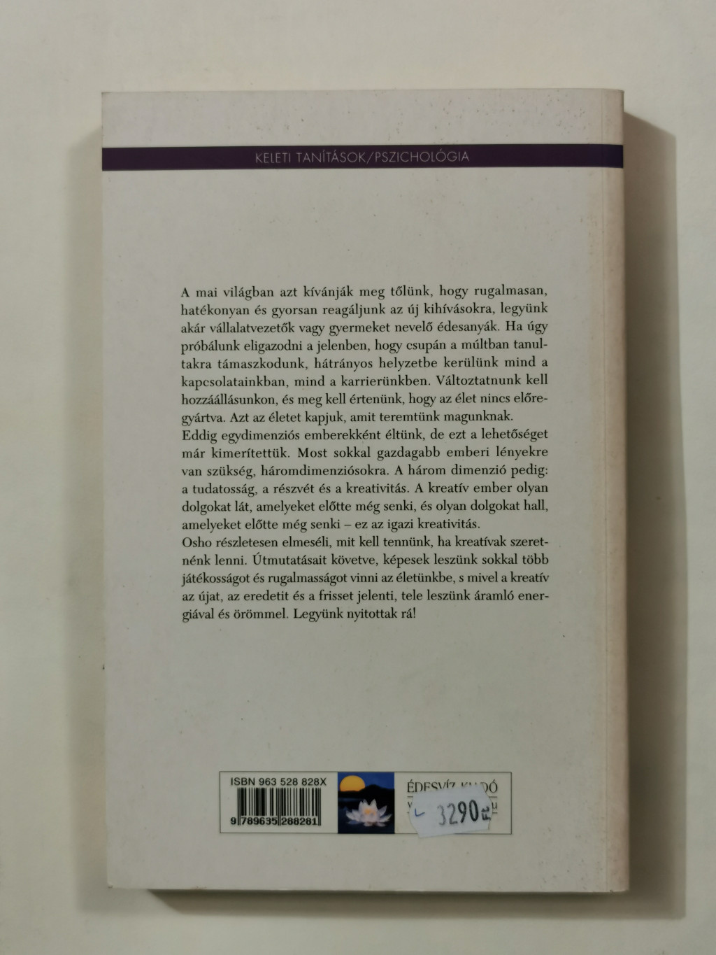 Eddig egydimenziós emberekként éltünk, de ezt a lehetőséget már kimerítettük. Osho szerint most sokkal gazdagabb emberi lényekre van szükség, háromdimenziósokra. A három dimenzió pedig: a tudatosság, a részvét és a kreativitás. A kreatív ember olyan dolgokat lát, amelyeket előtte még senki, és olyan dolgokat hall, amelyeket előtte még senki – ez az igazi kreativitás. Osho részletesen elmeséli, mit kell tennünk, ha kreatívak szeretnénk lenni. Útmutatásait követve, képesek leszünk sokkal több játékosságot és rugalmasságot vinni az életünkbe, s mivel a kreatív az újat, az eredetit és a frisset jelenti, tele leszünk áramló energiával és örömmel. Legyünk nyitottak rá!