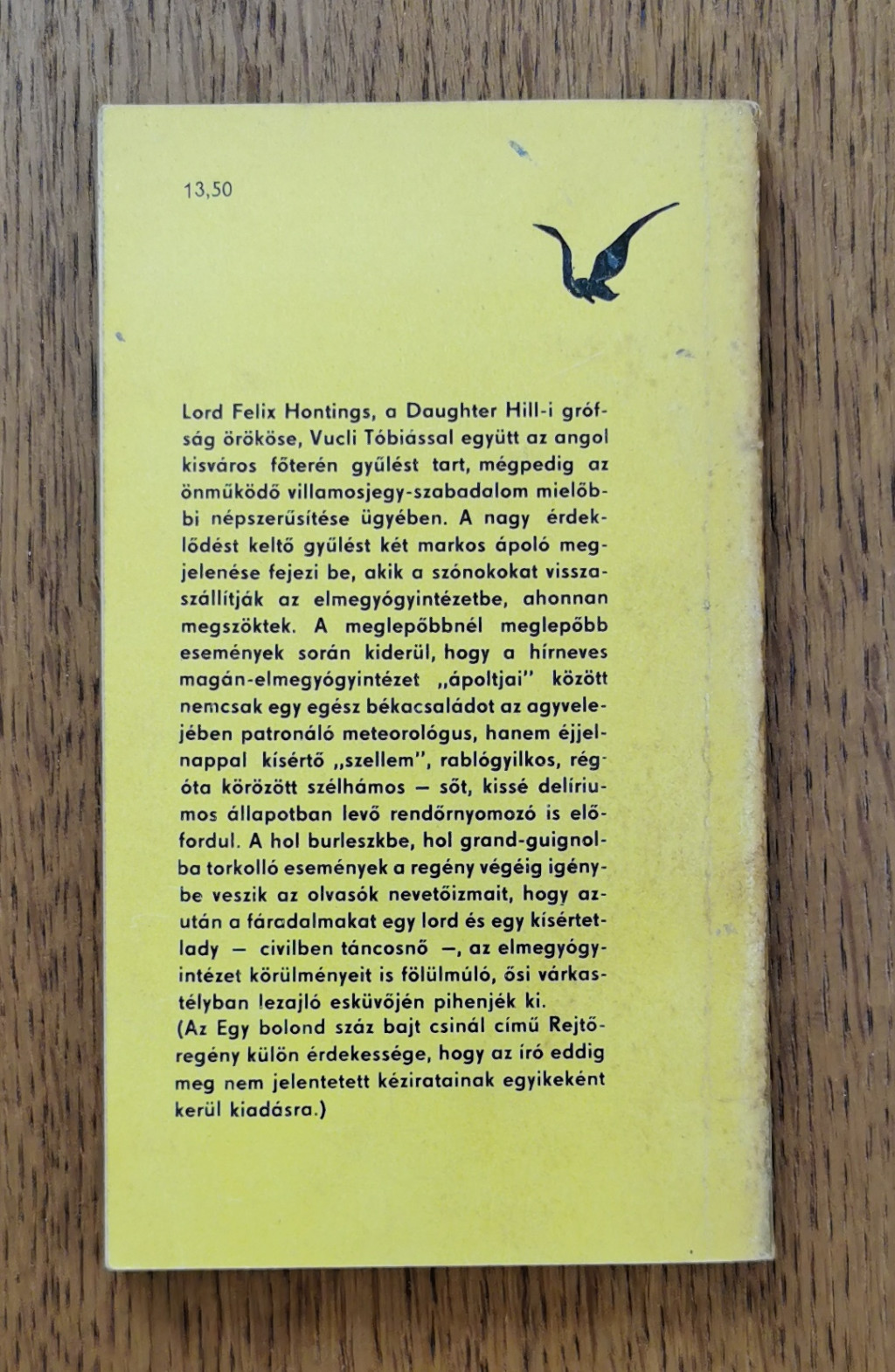 A hol burleszkbe, hol rémdrámába torkolló események a regény végéig igénybe veszik az olvasók nevetőizmait, hogy azután a fáradalmakat egy lord és egy kísértet-lady - civilben táncosnő - esküvőjén pihenjék ki, mely az elmegyógyintézet körülményeit is fölülmúló ősi várkastélyban zajlik.