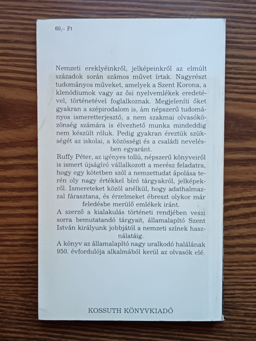 Ruffy Péter, az igényes tollú, népszerű könyveiről is ismert újságíró vállalkozott a merész feladatra, hogy egy kötetben szól a nemzettudat ápolása terén oly nagy értékkel bíró tárgyakról, jelképekről. Ismereteket közöl anélkül, hogy adathalmazzal fárasztana, és érzelmeket ébreszt olykor már feledésbe merülő emlékek iránt.