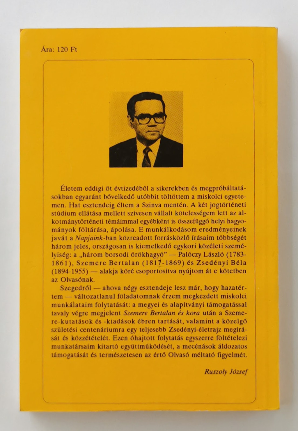 Életem eddigi öt évtizedéből a sikerekben és megpróbáltatásokban egyaránt bővelkedő utóbbit töltöttem a miskolci egyetemen. Hat esztendeig éltem a Szinva mentén. A két jogtörténeti stúdium ellátása mellett szívesen vállalt kötelességem lett az alkotmánytörténeti témáimmal egyébként is összefüggő helyi hagyományok föltárása, ápolása. E munkálkodásom eredményeinek javát a Napjaink-ban közreadott forrásközlő írásaim többségét három jeles, országosan is kiemelkedő egykori közéleti személyiség: a "három borsodi örökhagyó" - Palóczy László (1783-1861), Szemere Bertalan (1817-1869) és Zsedényi Béla (1894-1955) - alakja köré csoportosítva nyújtom át e kötetben az Olvasónak.