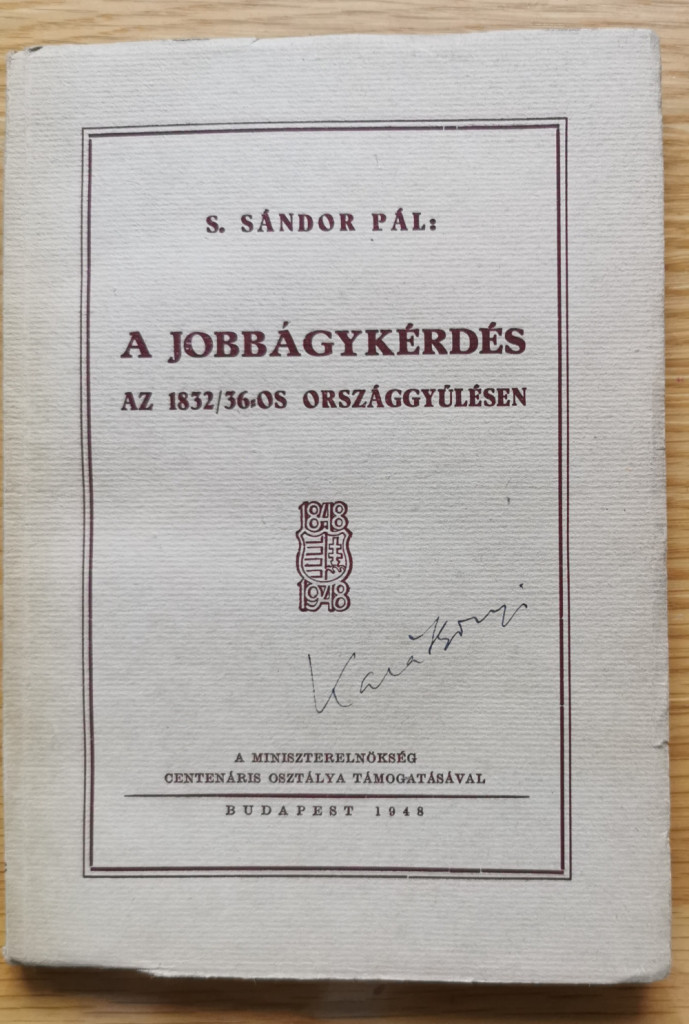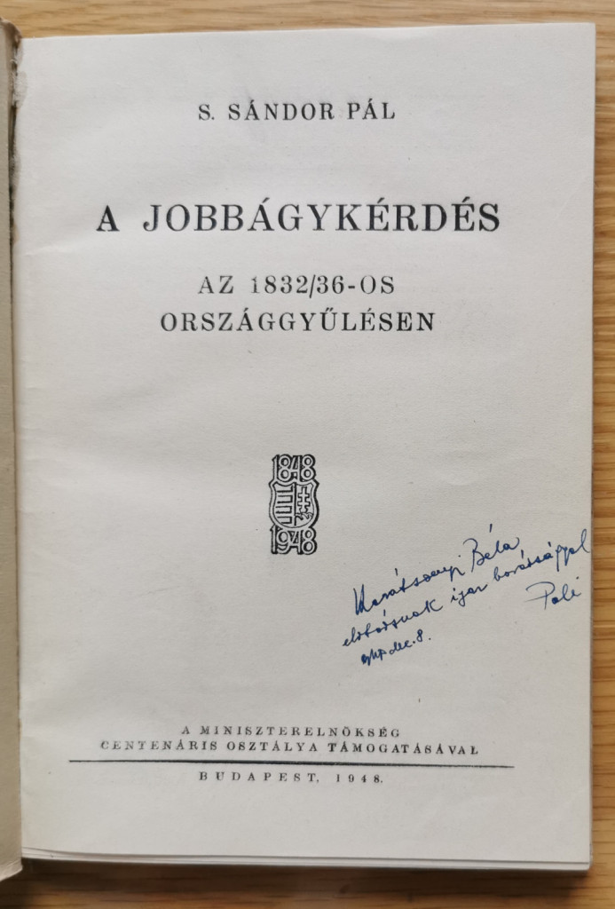 S. Sándor Pál: A jobbágykérdés az 1832/36-os országgyűlésen (Dedikált!)