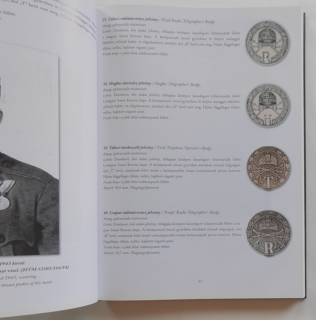 A fegyveres erőink által alkalmazott jelvények híven tükrözik saját korukat motívumrendszerük és fizikai kivitelük változásain keresztül, amelyről meggyőződhetünk, ha végiglapozzuk e könyvet, amely több száz színes tárgyfotóval, illetve – részben eddig publikálatlan – archív felvétellel mutatja be az 1938–1945 közötti időszak magyar katonai és katonai vonatkozású jelvényeit. Szerzője a HM Hadtörténeti Intézet és Múzeum Numizmatikai Gyűjteményének gyűjteményvezető főmuzeológusa, akinek a témában már számos tudományos és ismeretterjesztő publikációja látott napvilágot.