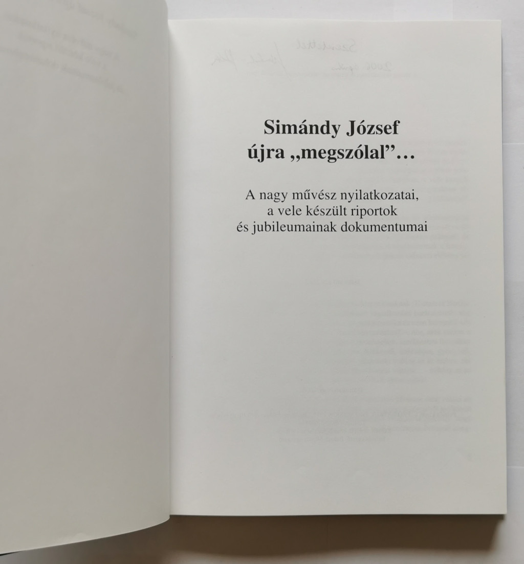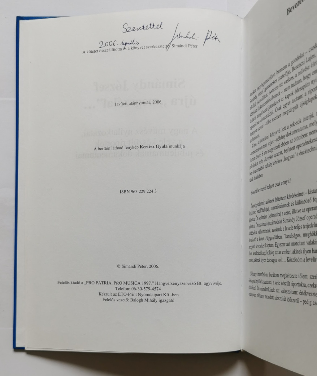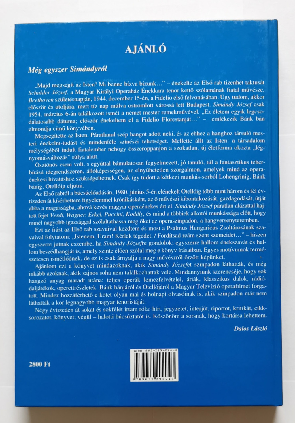 Ajánlom ezt a könyvet mindazoknak; akik Simándy Józsefet színpadon láthatták, és még inkább azoknak, akik sajnos soha nem találkozhattak vele. Mindannyiunk szerencséje, hogy sok hangzó anyag maradt utána: teljes operák lemezfelvételei, áriák, klasszikus dalok, rádiódaljátékok, operettrészletek. Bánk bánjáról és Otellójáról a Magyar Televízió operafilmet forgatott. Mindez hozzáférhető e kötet olyan mai és holnapi olvasóinknak is, akik színpadon már nem láthatták a kor legnagyobb magyar tenoristáját. Négy évtizeden át sokat és sokfélét írtam róla: hírt, jegyzetet, interjút, riportot, kritikát, cikksorozatot, könyvet; végül - halotti búcsúztatót is. Köszönöm a sorsnak, hogy kortársa lehettem.