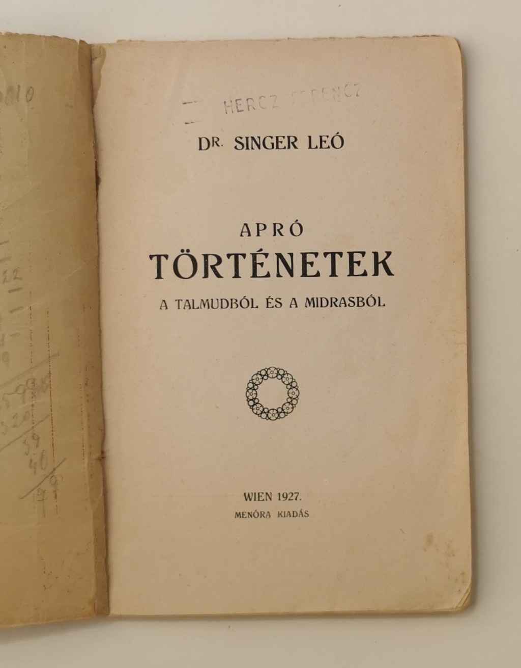 Singer Leó, Dr.: Apró történetek a Talmudból és a Midrasból. Wien [Bécs], 1927. Menóra kiadás (Pannónia-nyomda Budapest). 59+(5) p.