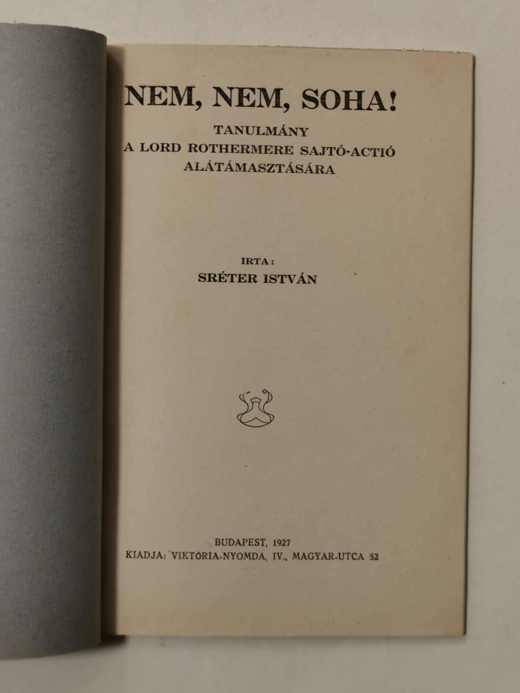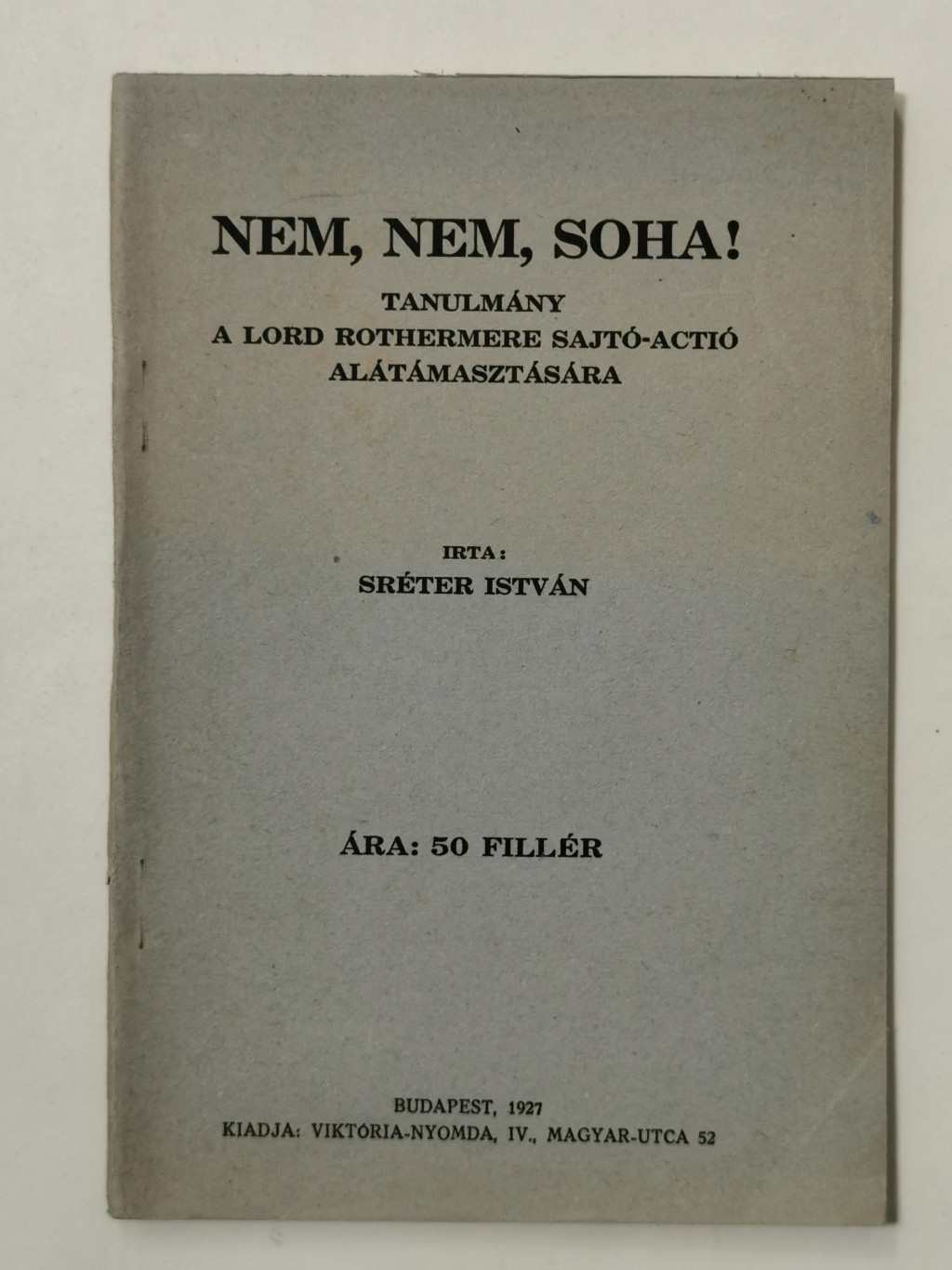 Sréter István: Nem, nem, soha! Tanulmány a Lord Rothermere sajtó-actió alátámasztására. Budapest, 1927. Viktória-nyomda. 48 p. + 1 térkép (kétszínnyomású, kihajtható). Egyetlen kiadás.