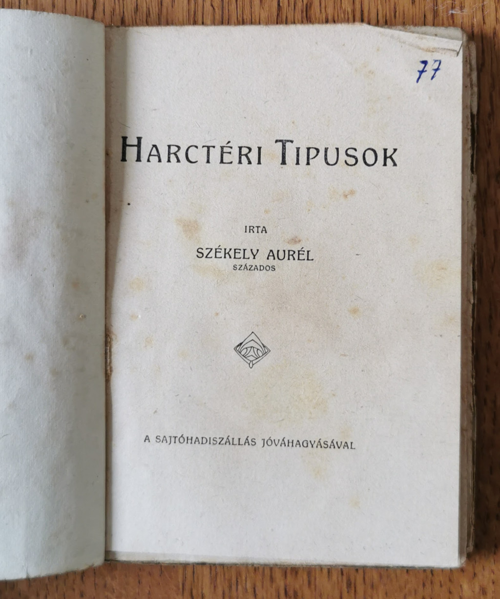 Székely Aurél: Harctéri tipusok [Budapest, 1920. Kultura.] 75+(4) p. Kiadói, illusztrált papírborítóban.