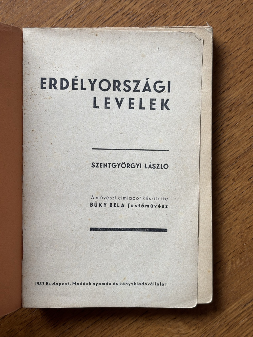 Szentgyörgyi László: Erdélyországi levelek. [Regény.] Budapest, 1937. Madách nyomda és könyvkiadóvállalat. 122 + [2] p. Egyetlen kiadás. A fametszetű borítófedelet Büky Béla festőművész készítette. Fűzve, illusztrált kiadói borítóban.