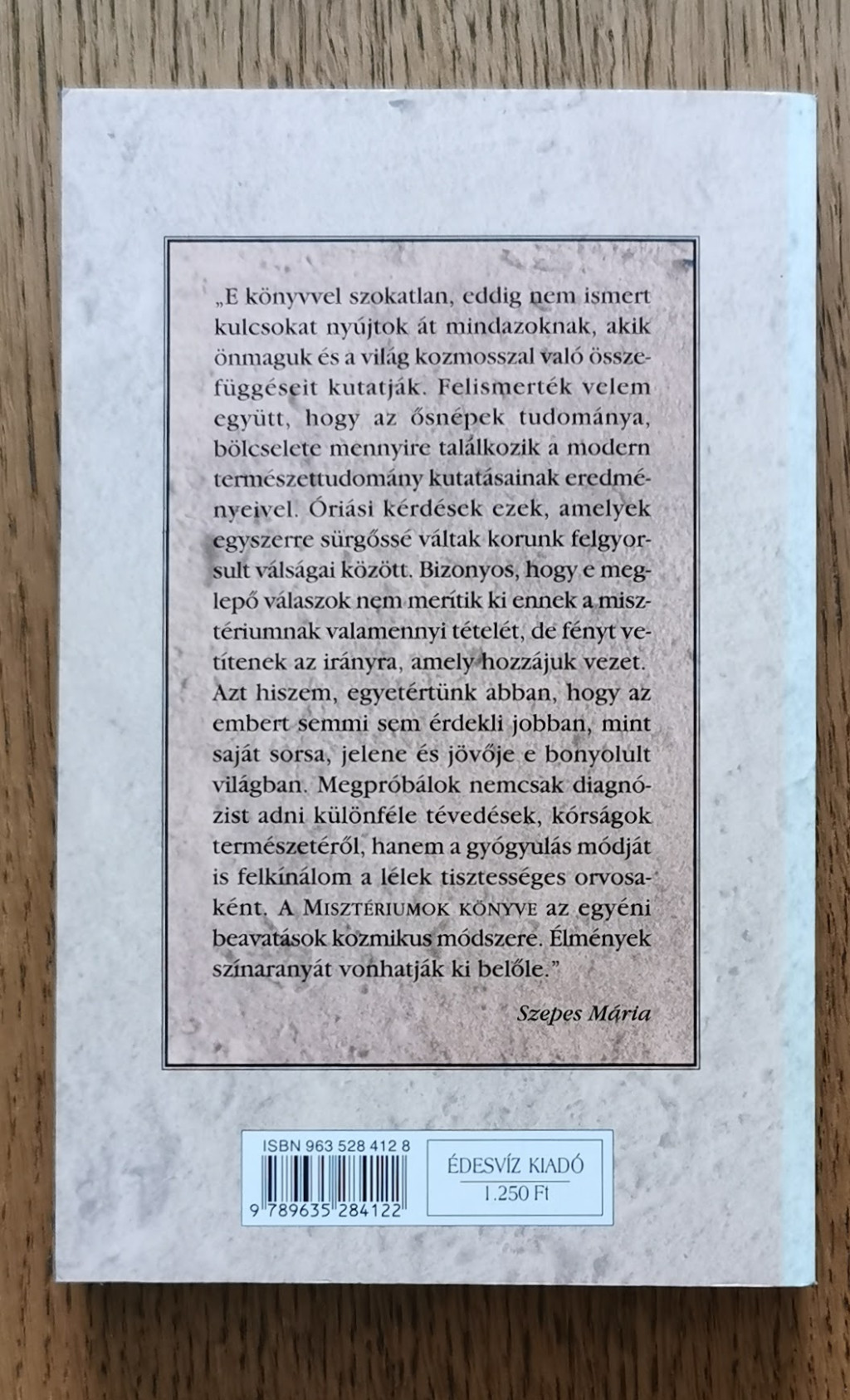"E könyvvel szokatlan; eddig nem ismert kulcsokat nyújtok át mindazoknak, akik önmaguk és a világ kozmosszal való összefüggéseit kutatják. Felismerték velem együtt, hogy az ősnépek tudománya, bölcselete mennyire találkozik a modern természettudomány kutatásainak eredményeivel. Óriási kérdések ezek, amelyek egyszerre sürgősség váltak korunk felgyorsult válságai között. Bizonyos, hogy e meglepő válaszok nem merítik ki ennek a misztériumnak valamennyi tételét, de fényt vetítenek az irányra, amely hozzájuk vezet. Azt hiszem, egyetértünk abban, hogy az embert semmi sem érdekli jobban, mint saját sorsa, jelene és jövője e bonyolult világban. Megpróbálok nemcsak diagnózist adni különféle tévedések, kórságok természetéről, hanem a gyógyulás módját is felkínálom a lélek tisztességes orvosaként. A Misztériumok könyve az egyéni beavatkozások kozmikus módszere. Élmények színaranyát vonhatják ki belőle."
