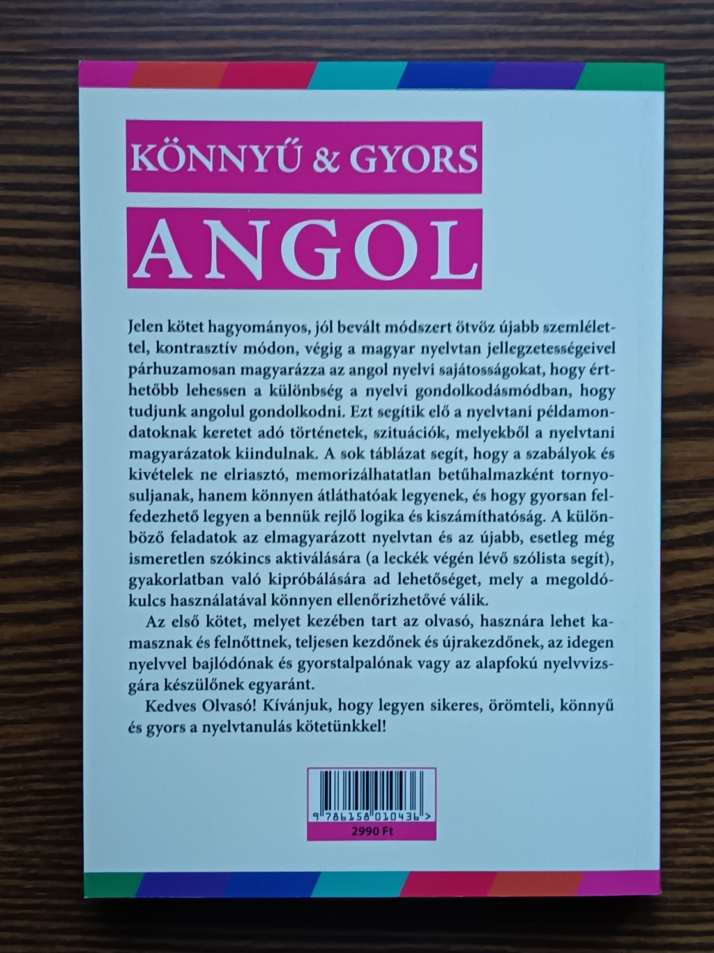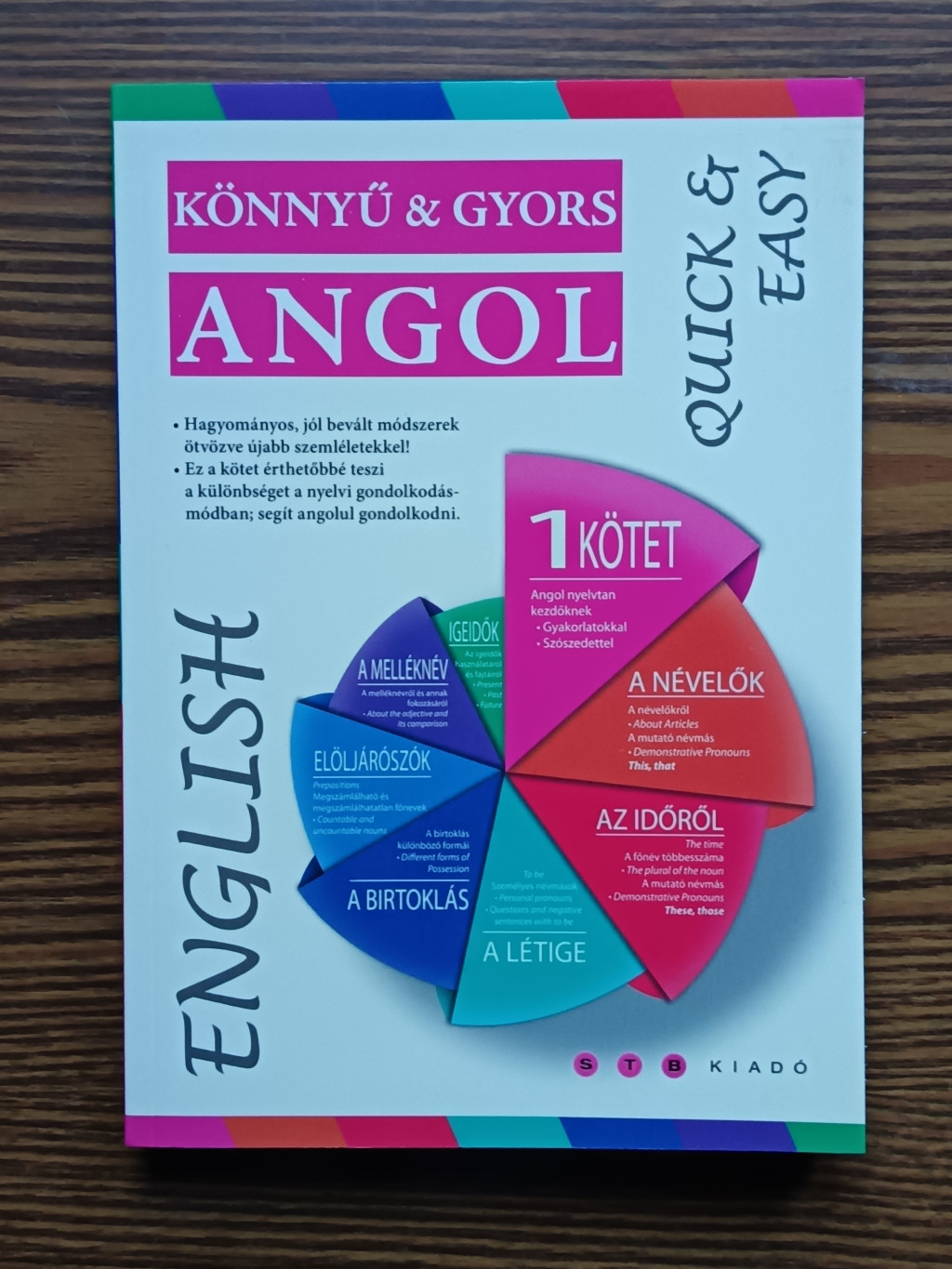 Jelen kötet hagyományos; jól bevált módszert ötvöz újabb szemlélettel, kontrasztív módon, végig a magyar nyelvtan jellegzetességeivel párhuzamosan magyarázza az angol nyelvi sajátosságokat, hogy érthetőbb lehessen a különbség a nyelvi gondolkodásmódban, hogy tudjunk angolul gondolkodni. Ezt segítik elő a nyelvtani példamondatoknak keretet adó történetek, szituációk, melyekből a nyelvtani magyarázatok kiindulnak. A sok táblázat segít, hogy a szabályok és kivételek ne elriasztó, memorizálhatatlan betűhalmazként tornyosuljanak, hanem könnyen átláthatóak legyenek, és hogy gyorsan felfedezhető legyen a bennük rejlő logika és kiszámíthatóság. A különböző feladatok az elmagyarázott nyelvtan és az újabb, esetleg még ismeretlen szókincs aktiválására (a leckék végén lévő szólista segít), gyakorlatban való kipróbálásra ad lehetőséget, mely a megoldókulcs használatával könnyen ellenőrizhetővé válik. Az első kötet, melyet kezében tart az olvasó, hasznára lehet kamasznak és felnőttnek, teljesen kezdőnek és újrakezdőnek, az idegen nyelvvel bajlódónak és gyorstalpalónak vagy az alapfokú nyelvvizsgára készülőnek egyaránt. Kedves Olvasó! Kívánjuk, hogy legyen sikeres, örömteli, könnyű és gyors a nyelvtanulás kötetünkkel!