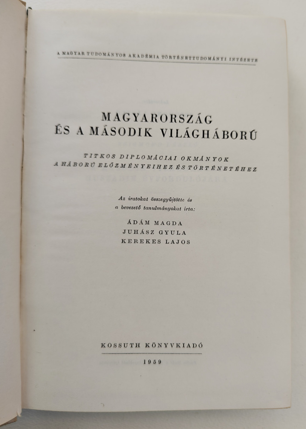 A Történettudományi Intézet munkatársai: Ádám Magda, Juhász Gyula és Kerekes Lajos állították össze ezt az értékes okmány-gyűjteményt. A kötetben titkos diplomáciai iratokat tettek közzé, továbbá a háborús bűnösök nürnbergi peréből egy-egy vallomásrészletet s a magyar kormány tevékenységére vonatkozó egyes jegyzőkönyveket.