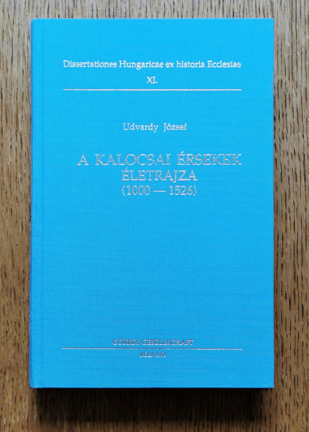 Udvardy József: A kalocsai érsekek életrajza (1000-1526) Köln, 1991. Görres Gesellschaft (Hofmann Druck AG, Augsburg). 500 p. {Dissertationes Hungaricae ex historia Ecclesiae XI.}. Kiadói, aranyozott egészvászon kötésben.