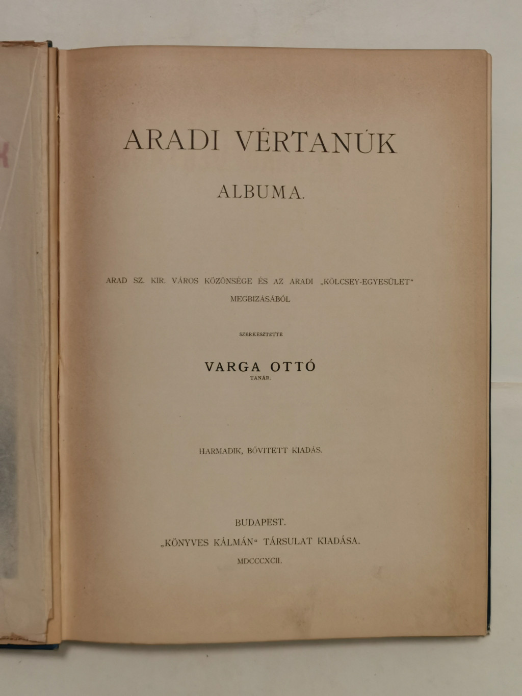 Aradi vértanúk albuma. Arad sz. kir. város közönsége és az aradi „Kölcsey-Egyesület” megbízásából szerkesztette Varga Ottó. Bp., 1892. Könyves Kálmán Társ. 1 t. díszcímlap+1 lev. (hártyapapírra nyomtatott magyarázat a képhez)+246 + [2] p.+8 mell. (1 t. és 7 kézirathasonmás, előtte hártyapapír, némelyiken nyomtatott magyarázat.). Harmadik kiadás.