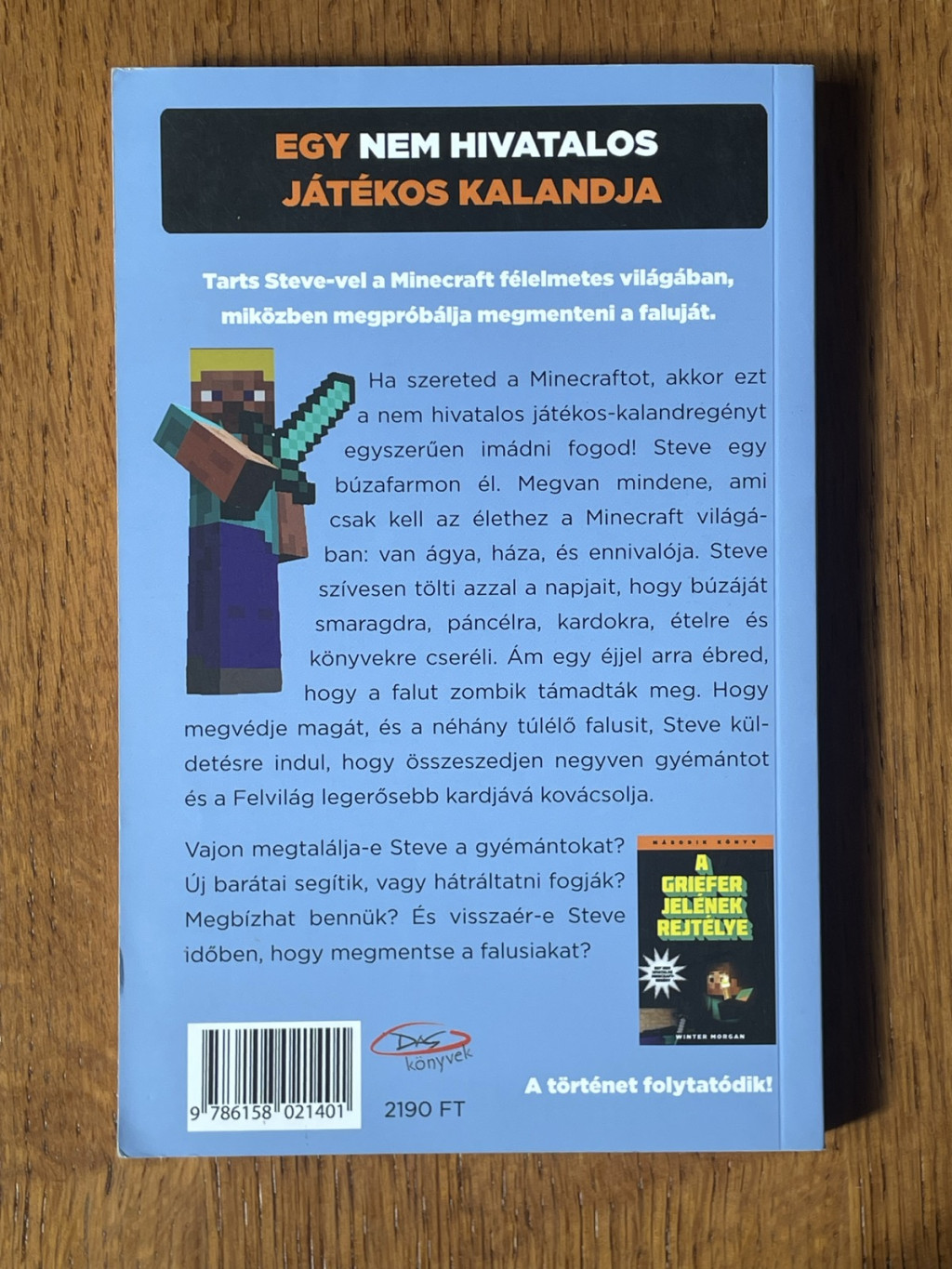 Ha szereted a Minecraftot, akkor ezt a nem hivatalos játékos-kalandregényt egyszerűen imádni fogod! Steve egy búzafarmon él. Megvan mindene, ami csak kell az élethez a Minecraft világában: van ágya, háza, és ennivalója. Steve szívesen tölti azzal a napjait, hogy búzáját smaragdra, páncélra, kardokra, ételre és könyvekre cseréli. Ám egy éjjel arra ébred, hogy a falut zombik támadták meg. Hogy megvédje magát, és a néhány túlélő falusit, Steve küldetésre indul, hogy összeszedjen negyven gyémántot és a Felvilág legerősebb kardjává kovácsolja.