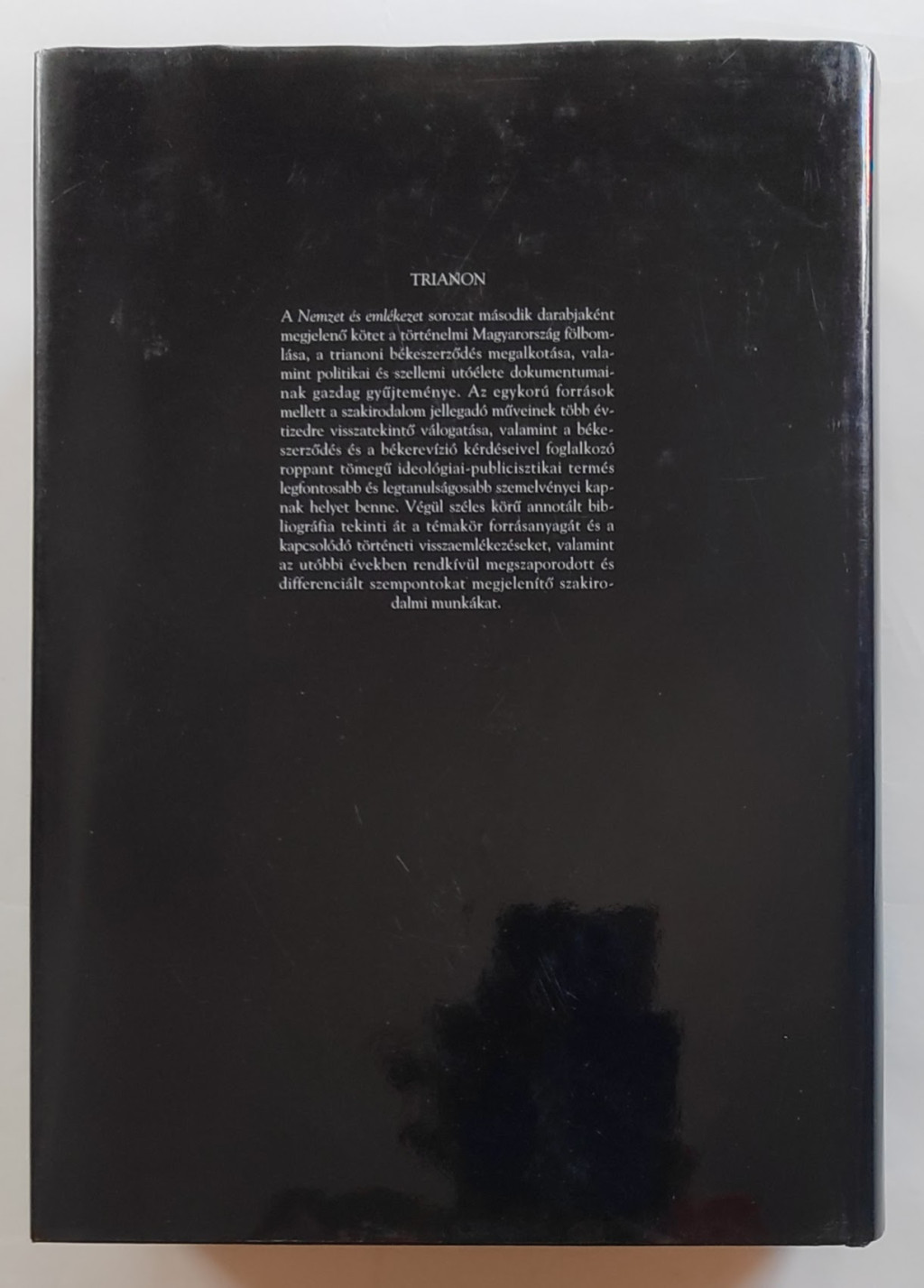 A Nemzet és emlékezet sorozat második darabjaként megjelenő kötet a történelmi Magyarország fölbomlása, a trianoni békeszerződés megalkotása, valamint politikai és szellemi utóélete dokumentumainak gazdag gyűjteménye. Az egykorú források mellett a szakirodalom jellegadó műveinek több évtizedre visszatekintő válogatása, valamint a békeszerződés és a békerevízió kérdéseivel foglalkozó roppant tömegű ideológiai-publicisztikai termés legfontosabb és legtanulságosabb szemelvényei kapnak helyet benne. Végül széles körű annotált bibliográfia tekinti át a témakör forrásanyagát és a kapcsolódó történeti visszaemlékezéseket, valamint az utóbbi években rendkívül megszaporodott és differenciált szempontokat megjelenítő szakirodalmi munkákat.