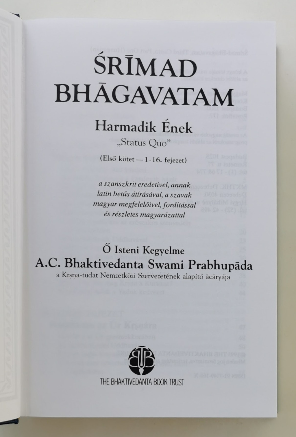 A Bhágavatam első, magyarázattal ellátott, teljes fordításával először találkozhat az olvasóközönség. Az első tizenkét kötet (az Első Énektől a Tizedik Ének első részéig) Ő Isteni Kegyelme A.C. Bhaktivedanta Swami Prabhupáda, a Krsna-tudat Nemzetközi Szervezetének alapító ácáryája, az indiai vallási és filozófiai bölcselet világszerte legelismertebb tanítója tudományos és odaadó erőfeszítésének eredménye. A szanszkrit nyelv terén bizonyított tudományos felkészültsége, alapos jártassága úgy a védikus kultúrában és gondolkodásban, mint a modern életmódban lehetővé teszi, hogy érdekfeszítően tárja a Nyugat elé ezt a jelentős művet.