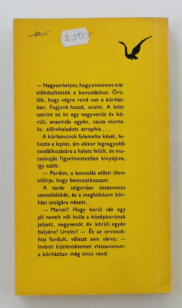 – Marcel! Hogy kerül ide egy jól nevelt női hulla a középkorúnak jelzett, negyvenöt év körüli egyén helyére? Uraim! – És az orvosokhoz fordult, választ sem várva: – Iménti kijelentésemet visszavonom: a kórházban még sincs rend. (…)”