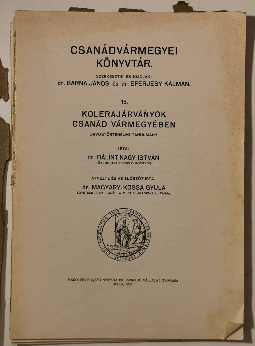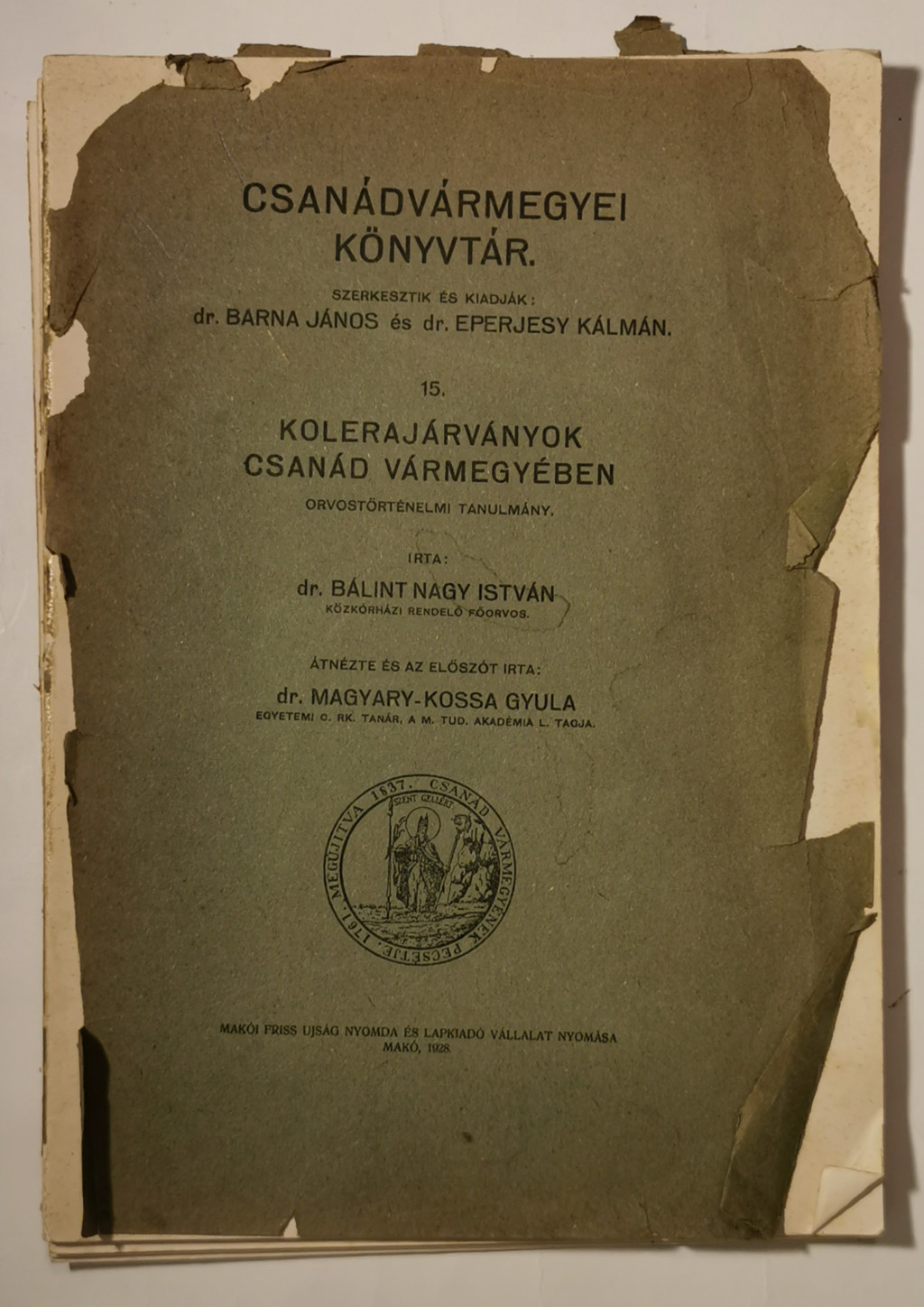 Bálint Nagy István - Kolerajárványok Csanád vármegyében. Átnézte és a előszót írta Magyary-Kossa Gyula. Makó, 1928. Csanád-Arad-Torontál vm. közönsége. 118 p. /Adatok Csanád vármegye közegészségügyének történetéhez I./ Szövegközti képekkel illusztrált.