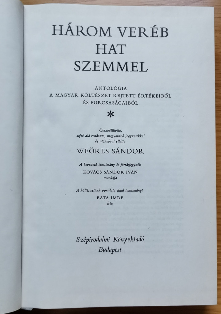 Weöres Sándor életművében kiemelt szerepet kap a Három veréb hat szemmel című; első kiadásban 1977-ben (Szépirodalmi), majd bővített változatban 1982-ben (Magvető) megjelent antológia, amely a költő szavaival rokontalan könyv a világon. A középkortól a XX. század kezdetéig tesz közzé "lappangó, rejtett, ismeretlen költői szépségeket, különös izgató zamatú, rendhagyó műveket, amelyekkel éppen különlegességük miatt nem tudtak mit kezdeni, évszázadokig hevertették hajdani nyomtatványokban új kiadás nélkül vagy éppen kéziratban, kiadatlanul".