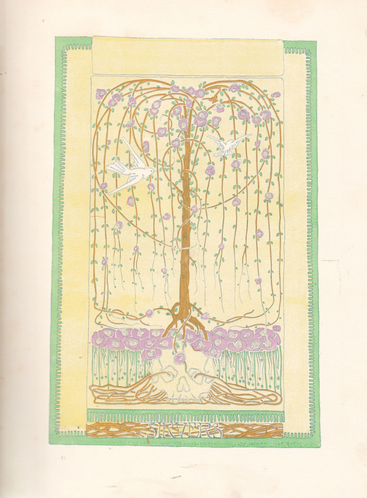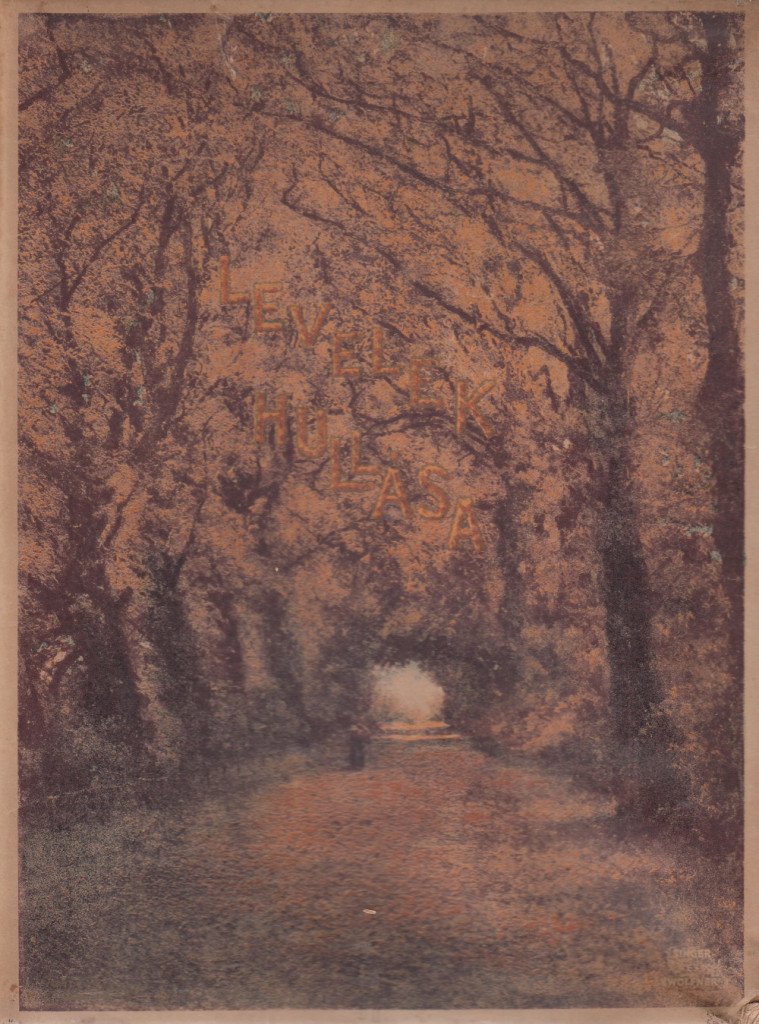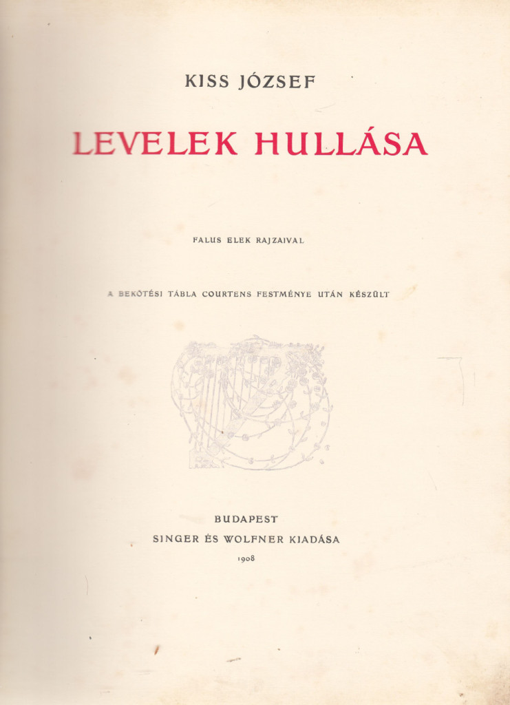 Kiss József: Levelek hullása. [Újabb költemények] Falus Elek rajzaival. Bp., 1908. Singer és Wolfner (Franklin-Társulat ny.). 1 t. (a költő fénynyomatú arcképe), 87+(2) p. Oldalszámozáson belül Falus Elek 9 színes, egészoldalas és 28 szövegközti illusztrációjával, könyvdíszeivel, illusztrált előzéklapjával. A kötéstábla Courtens festménye után készült. Első kiadás! Kiadói, aranyozott gerincű, illusztrált félvászon kötésben. Az egyik legismertebb és legszebb magyar szecessziós könyv. 276 mm. Jó állapotú példány.