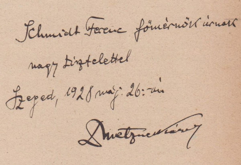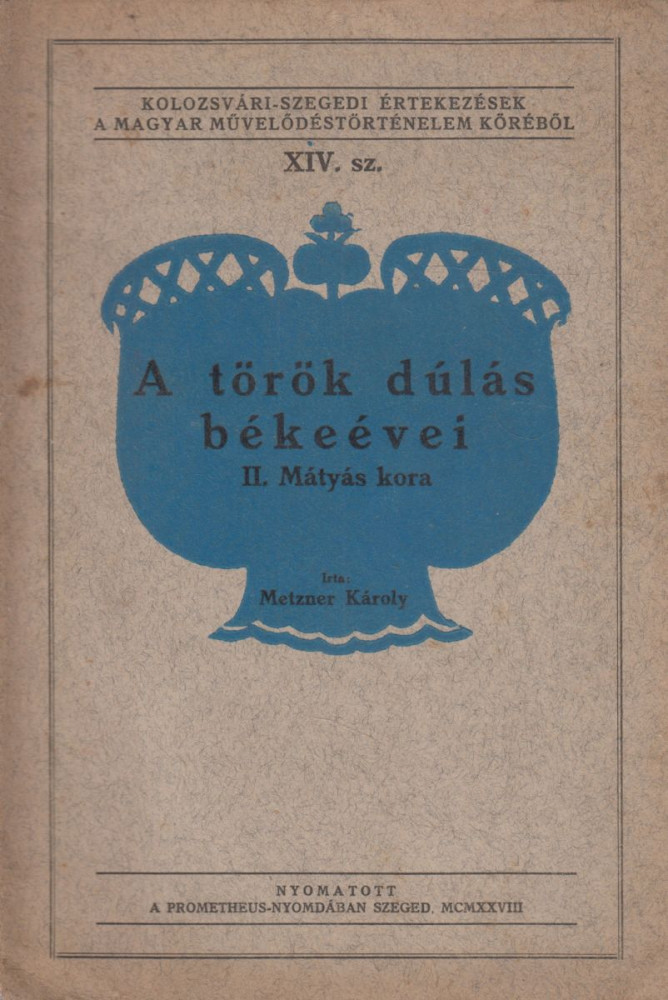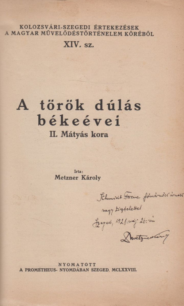 Metzner Károly: A török dúlás békeévei. II. Mátyás kora Szeged; 1928. (hibás dátum nyomtatva). Prometheus-Nyomda. 68 p. {Kolozsvári–szegedi értekezések a magyar művelődéstörténelem köréből XIV.}. Dedikált: „Schmidt Ferenc főmérnök úrnak nagy tisztelettel Szeged, 1928 máj. 26.-án Dr. Metzner Károly”. Fűzve, kiadói, illusztrált papírborítóban. 230 mm. Jó állapotú példány.