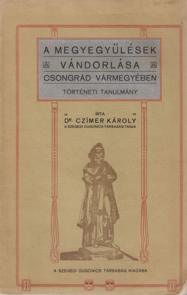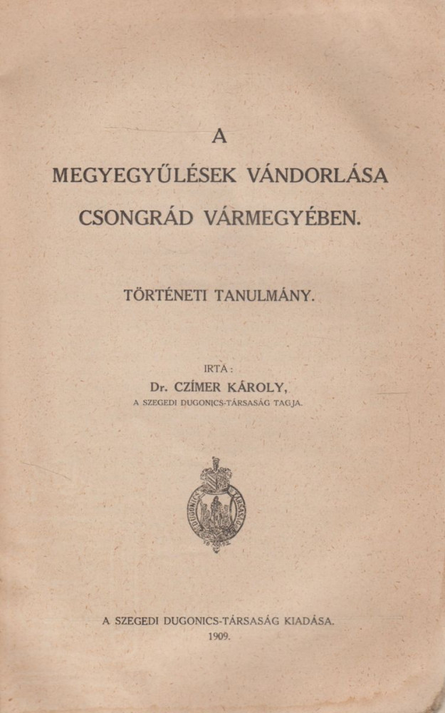 Czímer Károly: A megyegyűlések vándorlása Csongrád vármegyében. Történeti Tanulmány (Szeged); 1909. Szegedi Dugonics-Társaság (Endrényi Imre ny.). 49 + (3) p. Fűzve, kiadói, színes, illusztrált, sarkain javított, keretdíszes papírborítóban. A lapok alsó sarkai – szöveget nem érintve – kis mértékben sérültek, szélei halványan foltosak, néhány oldalon ceruzás aláhúzás. 224 mm.