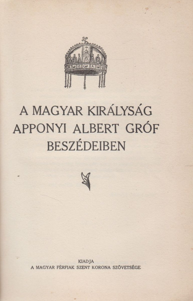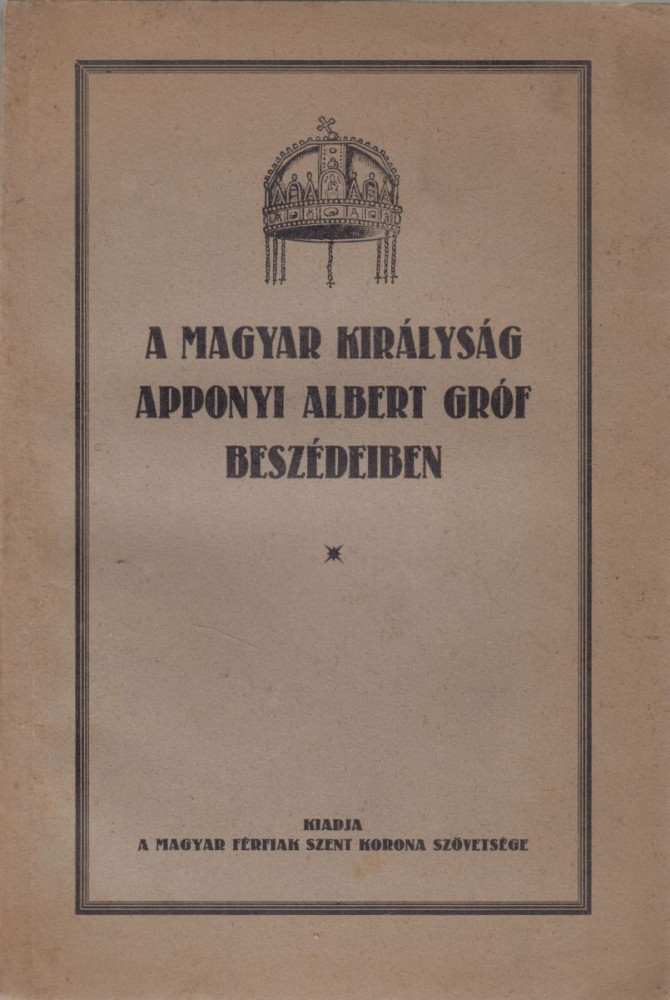 [Apponyi Albert; gróf]: A Magyar királyság Apponyi Albert gróf beszédeiben (Bp., 1933.) Magyar Férfiak Szent Korona Szövetsége. 88 + (2) p. + 1 t. Fűzve, kiadói, keretdíszes, illusztrált papírborítóban. 230 mm. Jó állapotú példány.