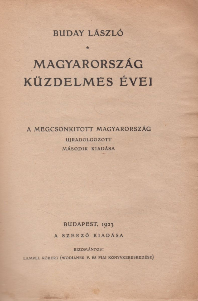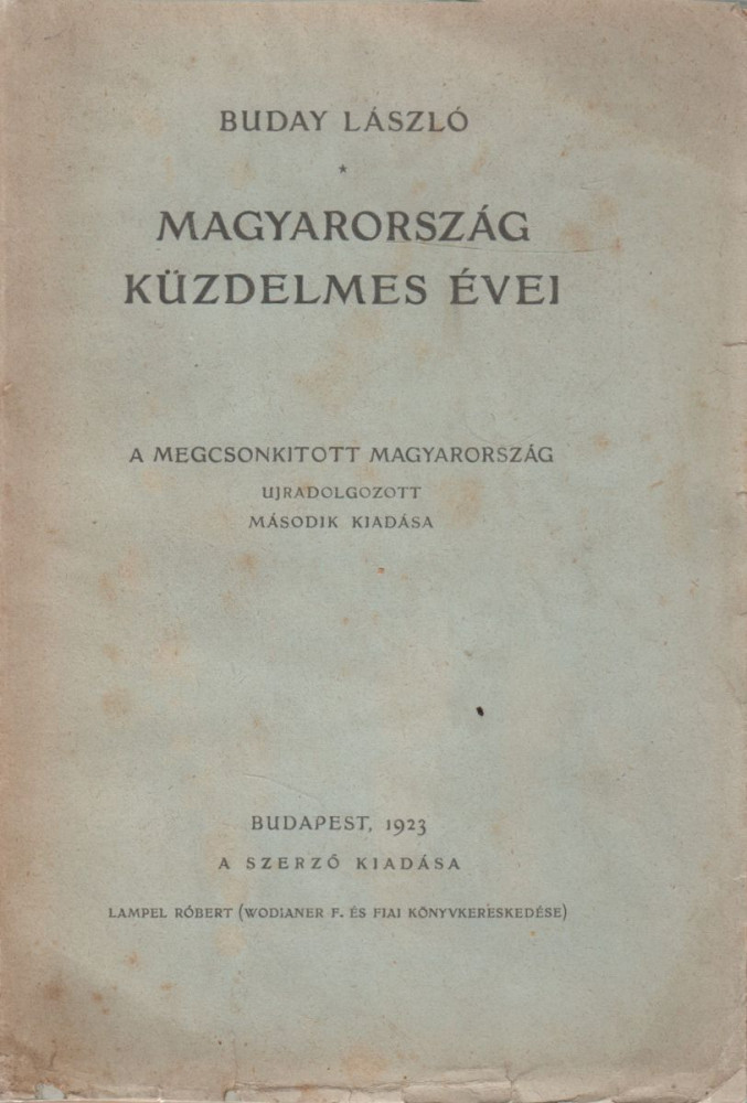 Buday László: Magyarország küzdelmes évei. A megcsonkított Magyarország ujradolgozott második kiadása Bp.; 1923. Szerző (Lampel). 223 + (1) p. Fűzve, kiadói, a borítófedél hátlapján pótolt papírborítóban. 210 mm. Körülvágatlan példány.