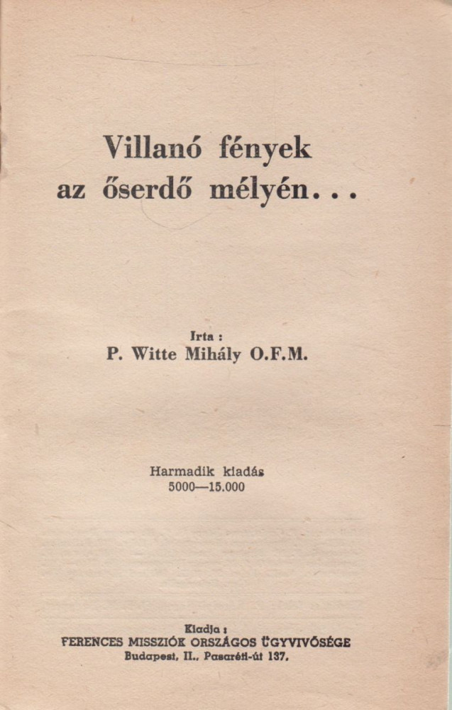 Bp., (1942.) Ferences Missziók Országos Ügyvivősége, Kapisztrán nyomda, Vác. 52 p. {Ferences világmissziók beszámolók és elbeszélések 8. szám}. Szöveg közti fényképekkel illusztrálva. Tűzve, kiadói, illusztrált papírborítóban. 164 mm. Szép példány.