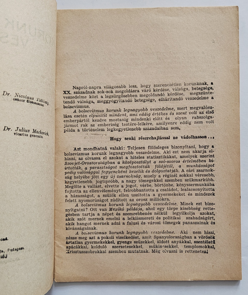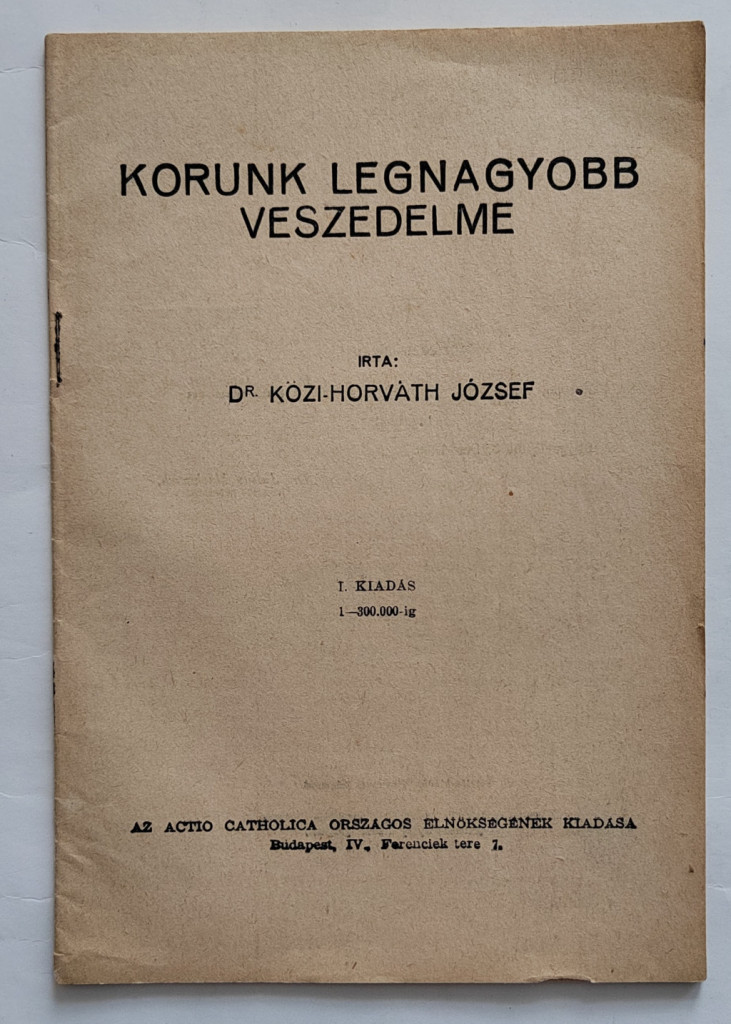 Közi-Horváth József: Korunk legnagyobb veszedelme. Budapest, (1936). Actio Catholica Országos Elnökségének kiadása (Pallas Irodalmi és Nyomdai Rt.) 24 p. Első kiadás. Antibolsevista röpirat. A mű szerepel az Ideiglenes Nemzeti Kormány által 1945-ben kiadott, tiltott könyvek listáján. Fűzve, borító nem készült hozzá.