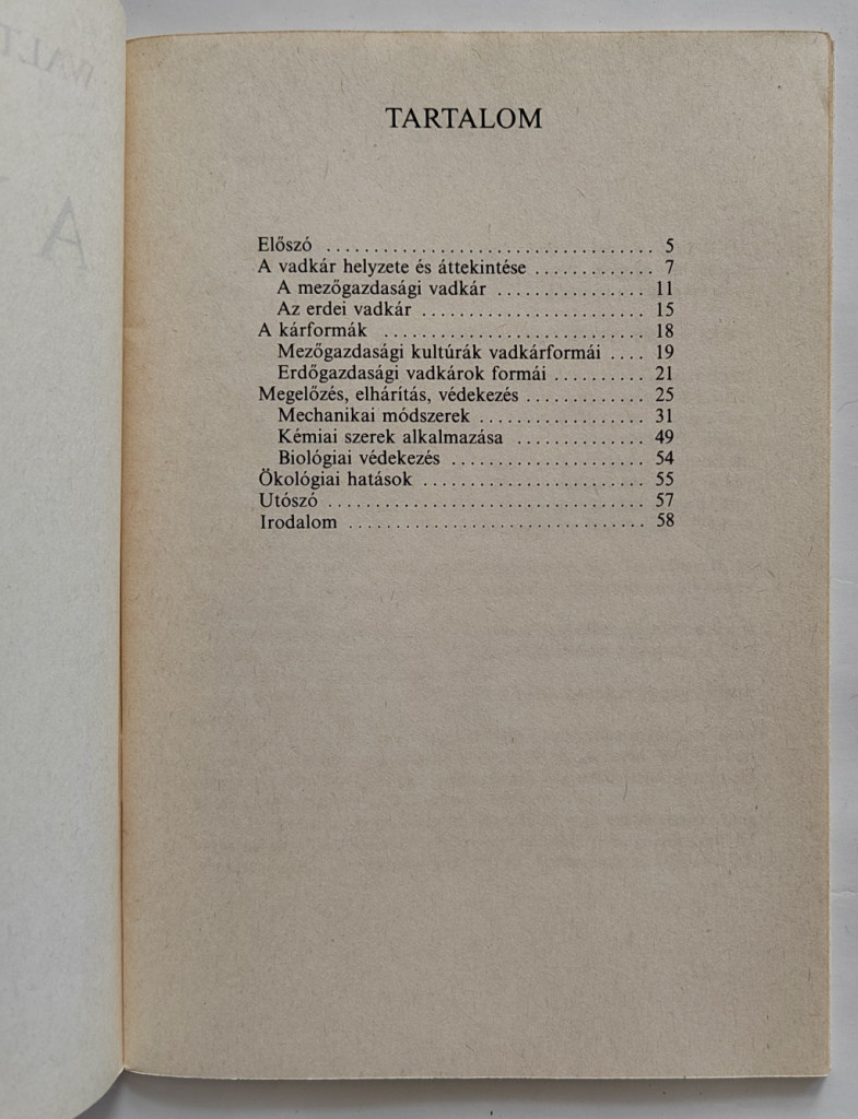 A szerző ismerteti a témához kapcsolódó jogszabályokat, majd átfogó képet nyújt a mezőgazdasági és az erdei vadkárok hazai és külföldi szakirodalmáról. A hazai szakirodalom főként az Ő 20 éves kutatói munkájához kapcsolódik, akár a mezőgazdasági, akár pedig az erdei vadkárt vesszük figyelembe. A külföldi adatok elsősorban a német szakirodalom feldolgozásából születtek.
