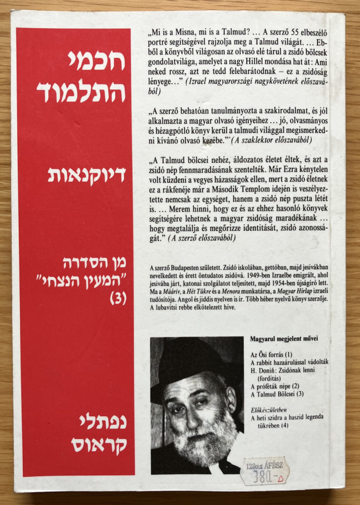 Mi a Talmud? Hogyan keletkezett? Kik voltak azok a bölcsek, akik a világ egyik legismertebb és legtöbb legenda övezte művét megalkották? Ezekre és még sok más kérdésre is választ ad a tudós szerző, miközben a Talmud bölcseiről ír közérthető, szórakoztató stílusban. A szerző Budapesten született (1932). Zsidó iskolában, a pesti gettóban, majd jesivákban nevelkedett. 1949-ben allijázott (kivándorolt Izraelbe), ahol jesivába járt, katonai szolgálatot teljesített (2 és fél év), majd 1954-től újságíróként dolgozott. A Mááriv és a Házofe napilapok munkatársa, valamint a New York-i Allgemeine Journal (jiddis nyelvű hetilap) izraeli tudósítója. Három éven át a pesti Magyar Hírlap izraeli tudósítója, majd a Kossuth Rádió munkatársa. Több héber nyelvű könyv szerzője. Nős, 16 unokája van. A lubavitsi haszid mozgalom híve.