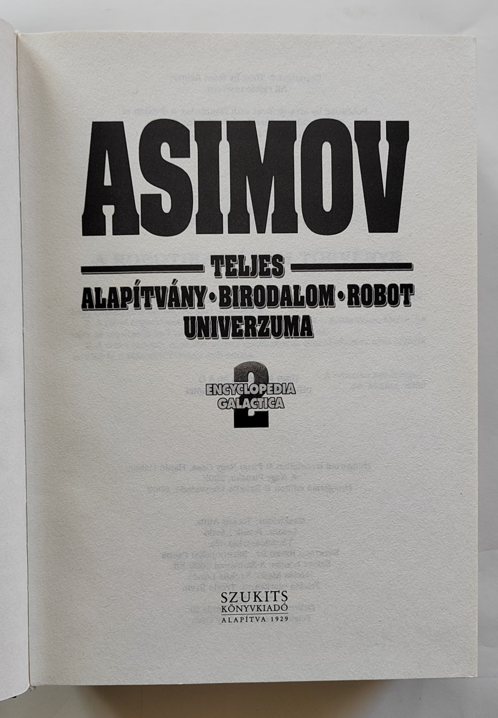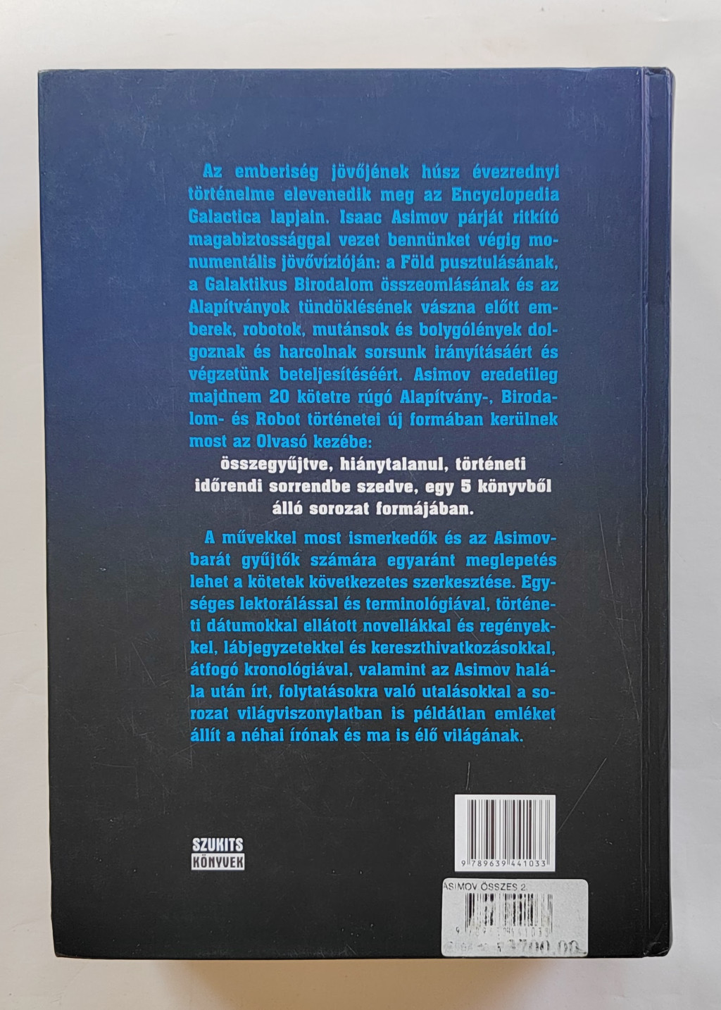 Az emberiség jövőjének húsz évezrednyi történelme elevenedik meg a most induló sorozat lapjain. Isaac Asimov párját ritkító magabiztossággal vezet bennünket végig monumentális jövővízióján: a Föld pusztulásának, a Galaktikus Birodalom összeomlásának és az Alapítványok tündöklésének vászna előtt emberek, robotok, mutánsok és bolygólények dolgoznak és harcolnak sorsunk irányításáért és végzetünk beteljesítéséért. Asimov eredetileg majdnem húsz kötetre rúgó Alapítvány-, Birodalom- és Robot történetei új formában kerülnek most az Olvasó kezébe: összegyűjtve, hiánytalanul, történeti időrendi sorrendbe szedve, egy 5 könyvből álló sorozat formájában.