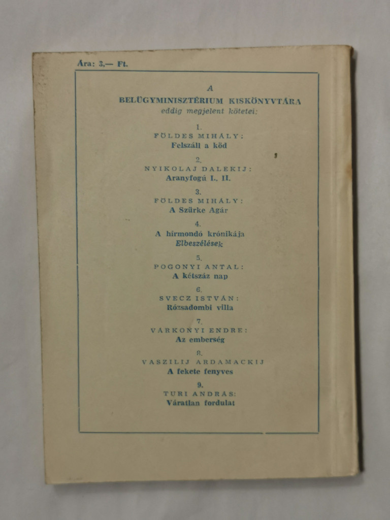 "Rákapcsolt. A zöld Moszkvics még jobban nekilendült; kerekei szinte nem is érintették már az országút aszfaltját, felette repültek, mint a madarak. A fiatalember szilárd kézzel tartotta a kormányt. A nyitott kocsiablakon át bevágott a szél, a haját borzolta, arcát hűsítette. Két oldalt a Rómaipart lámpasora, mint megannyi csillag. De szép az élet! De jó rohanni, úrnak lenni a motor fölött! Az autóbusz keresztezésnél forgalmi rendőr állt, várnia kellett. A férfi szeretettel nézte, milyen higgadtak, nyugodtak mozdulatai. Most intett: mehet tovább! Lassított, jobbra fordult, azután ismét balra. Az Árnyas úton, amerre csak ellátott, fények ragyogtak, egy kerthelyiségből cigányzene hangja szűrődött ki, egy lampionos teraszon néhány pár táncolt összesimulva, az üdülők, és csónakházak sötétlő kertjei közt, ki-kivillant a folyó szalagja, vizén kis fénycsíkok táncoltak. S odafent a csillagok. Mennyi csillag! Millió, milliárd. Valamennyi neki ragyog. Koltai Péternek, a Különleges Műszergyár huszonkilencéves technikusának, aki saját kocsiján hajt itt a sötétlő fasorban és előre örül az előtte álló édes éjszakának."