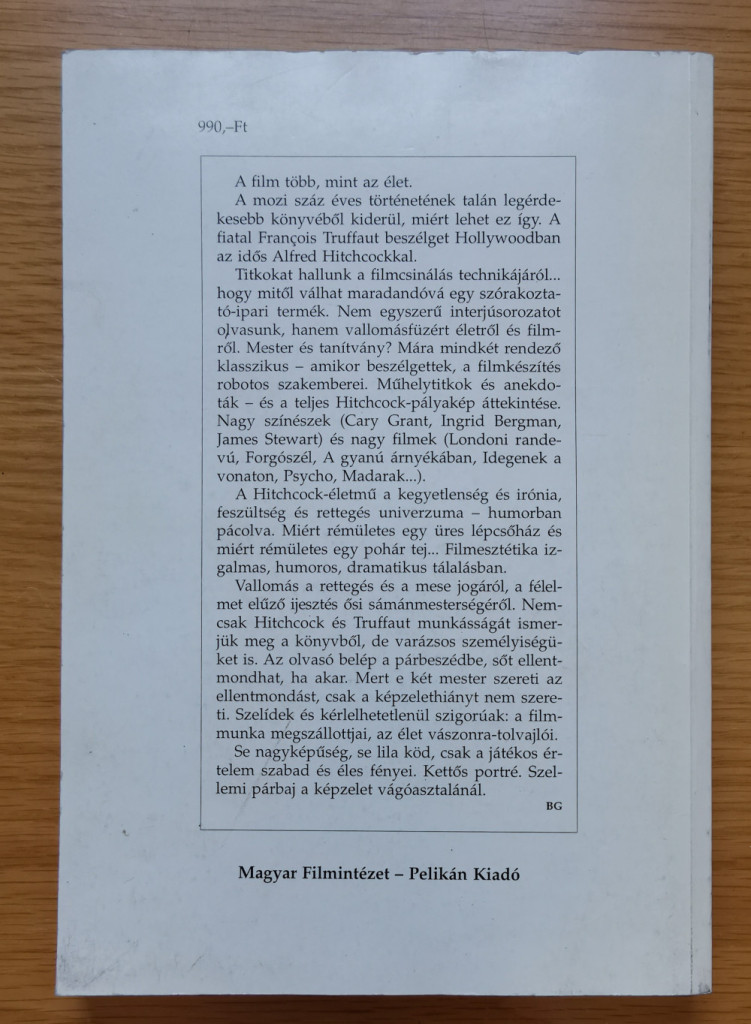 A fiatal Francois Truffaut beszélget Hollywoodban az idős Alfred Hitchcockkal. Titkokat hallunk a filmcsinálás technikájáról... hogy mitől válhat maradandóvá egy szórakoztató-ipari termék. Nem egyszerű interjúsorozatot olvasunk, hanem vallomásfüzért életről és filmről. Mester és tanítvány? Mára mindkét rendező klasszikus - amikor beszélgettek, a filmkészítés robotos szakemberei. Műhelytitkok és anekdoták - és a teljes Hitchcock-pályakép áttekintése. Nagy színészek (Cary Grant, Ingrid Bergman, James Stewart) és nagy filmek (Londoni randevú, Forgószél, A gyanú árnyékában, Idegenek a vonaton, Psycho, Madarak...).