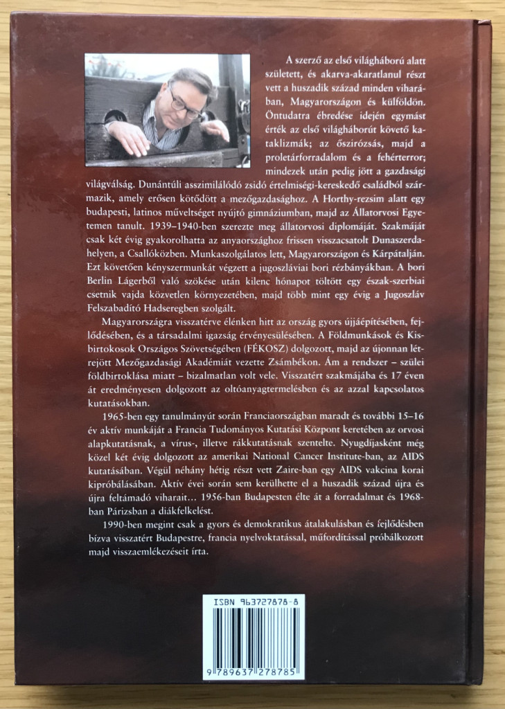 A szerző állatorvos. Franciaországban és az USA-ban is ismert kutató; aki eredményesen dolgozott az oltóanyag-termelésben. Zaire-ben egy AIDS vakcina korai kipróbálásában is részt vett. 1939-1940-ben szerezte meg állatorvosi diplomáját. 2 év múlva munkaszolgálatos lett, Kárpátalján és a bori lágerben. Kalandos életpálya, kitűnő stílus, olvasmányos mű.