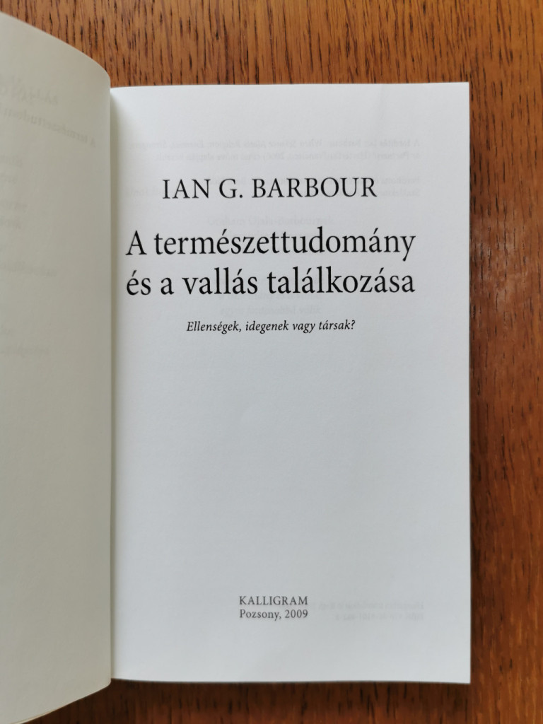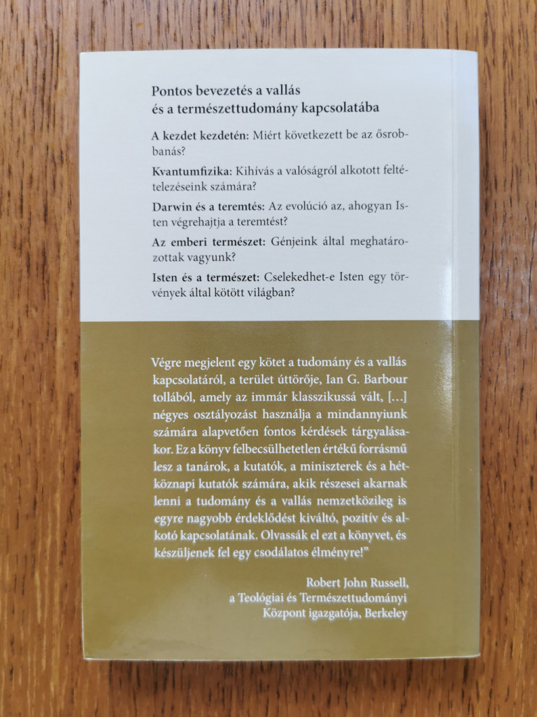 Pontos bevezetés a vallás és a természettudomány kapcsolatába A kezdet kezdetén: Miért következett be az ősrobbanás? Kvantumfizika: Kihívás a valóságról alkotott feltételezéseink számára? Darwin és a teremtés: Az evolúció az; ahogyan Isten végrehajtja a teremtést? Az emberi természet: Génjeink által meghatározottak vagyunk? Isten és a természet: Cselekedhet-e Isten egy törvények által kötött világban? Végre megjelent egy kötet a tudomány és a vallás kapcsolatáról, a terület úttörője, Ian G. Barbour tollából, amely az immár klasszikussá vált, [ ] négyes osztályozást használja a mindannyiunk számára alapvetően fontos kérdések tárgyalásakor. Ez a könyv felbecsülhetetlen értékű forrásmű lesz a tanárok, a kutatók, a miniszterek és a hétköznapi kutatók számára, akik részesei akarnak lenni a tudomány és a vallás nemzetközileg is egyre nagyobb érdeklődést kiváltó, pozitív és alkotó kapcsolatának. Olvassák el ezt a könyvet, és készüljenek fel egy csodálatos élményre!"