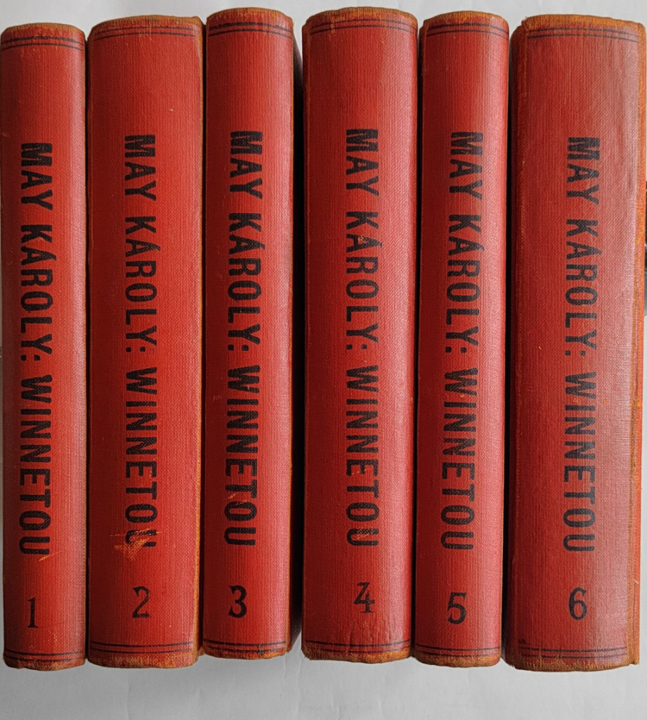 May Károly [May, Karl] : Winnetou 1–6. köt. Teljes kiadás három kötetben. Ford. Kosáryné Réz Lola. Fáy Dezső rajzaival. [Hat kötetbe kötve.] Bp., (1927), Athenaeum. 251 p.+3 t.; (2)+252–613+(3) p., 3 t.; 240 p.+5 t.; (3)+(241)–570 p.+1 t.; 250 p.+3t.; (2)+(251)–636+(1) p.,+3 t. /May Károly uti kalandjai./ Kiadói, egységes, festett, aranyozott vászonkötésben, szép állapotban.