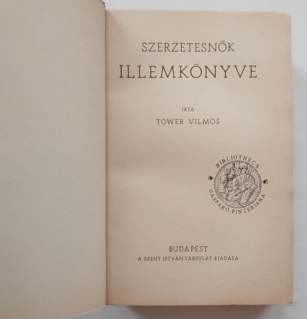 Tower Vilmos: Szerzetesnők illemkönyve. Bp.,1941. Szent István-Társulat. 414 p.Kiadói papírkötésben. Szép állapotban. 200x130 mm.