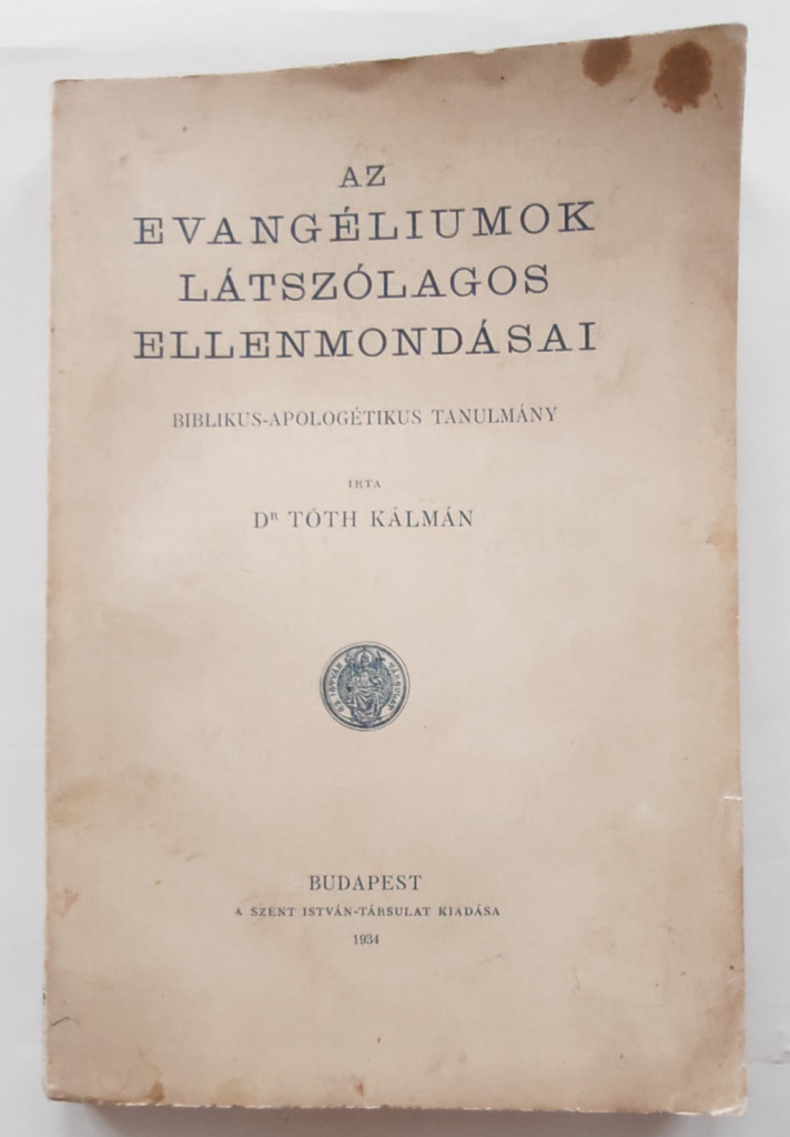 Tóth Kálmán, Dr.: Az evangéliumok látszólagos ellenmondásai Bp., 1934. Szent István-Társulat. 168+(4) p. Kiadói papírborítóban, szép állapotban. 240x160 mm.
