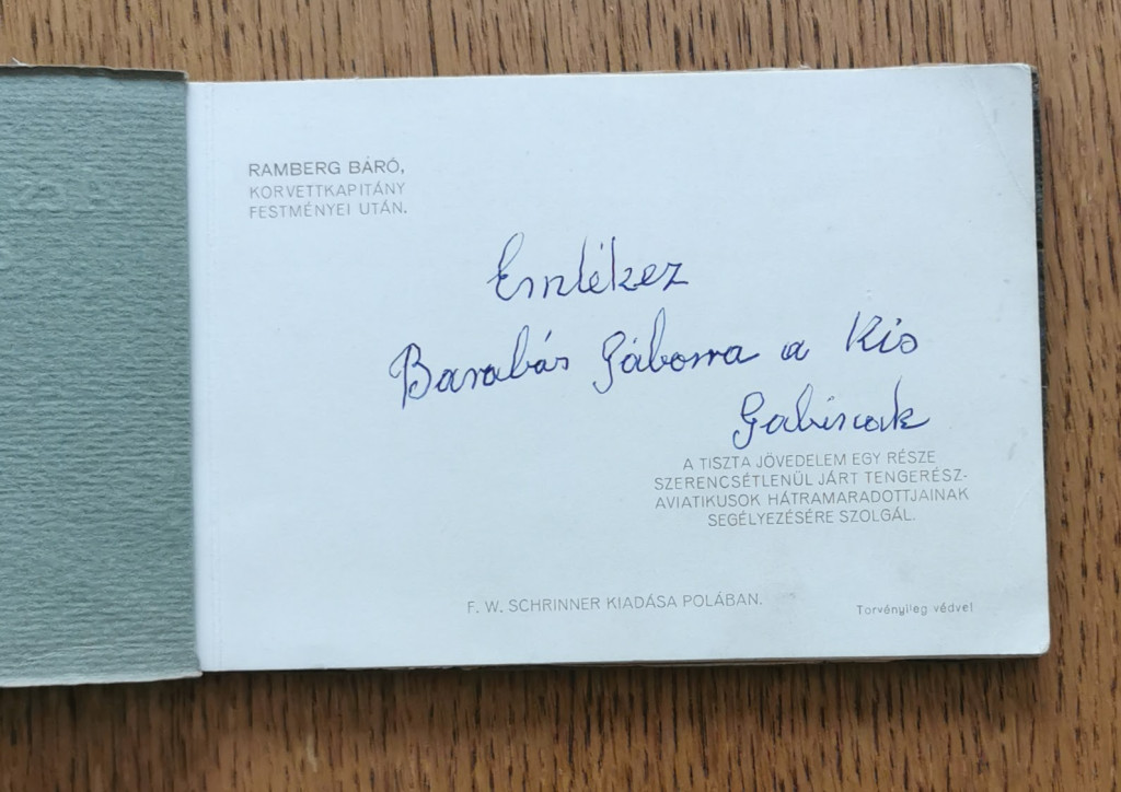 Ramberg, [August Freiher] báró: A cs. és kir. Haditengerészet a világháborúban. Ramberg báró, korvettkapitány festményei után. A tiszti jövedelem egy része szerencsétlenül járt tengerész aviatikusok hátramaradottjainak segélyezésére szolgált. (Pola), [1917]. F. W. Schrinner (Unie ny.). [2], 18 t. (1 portré Haus Antal, 17 csatajelenet). Leporello. Kiadói, zsinórral átfűzött, papírborítóban.